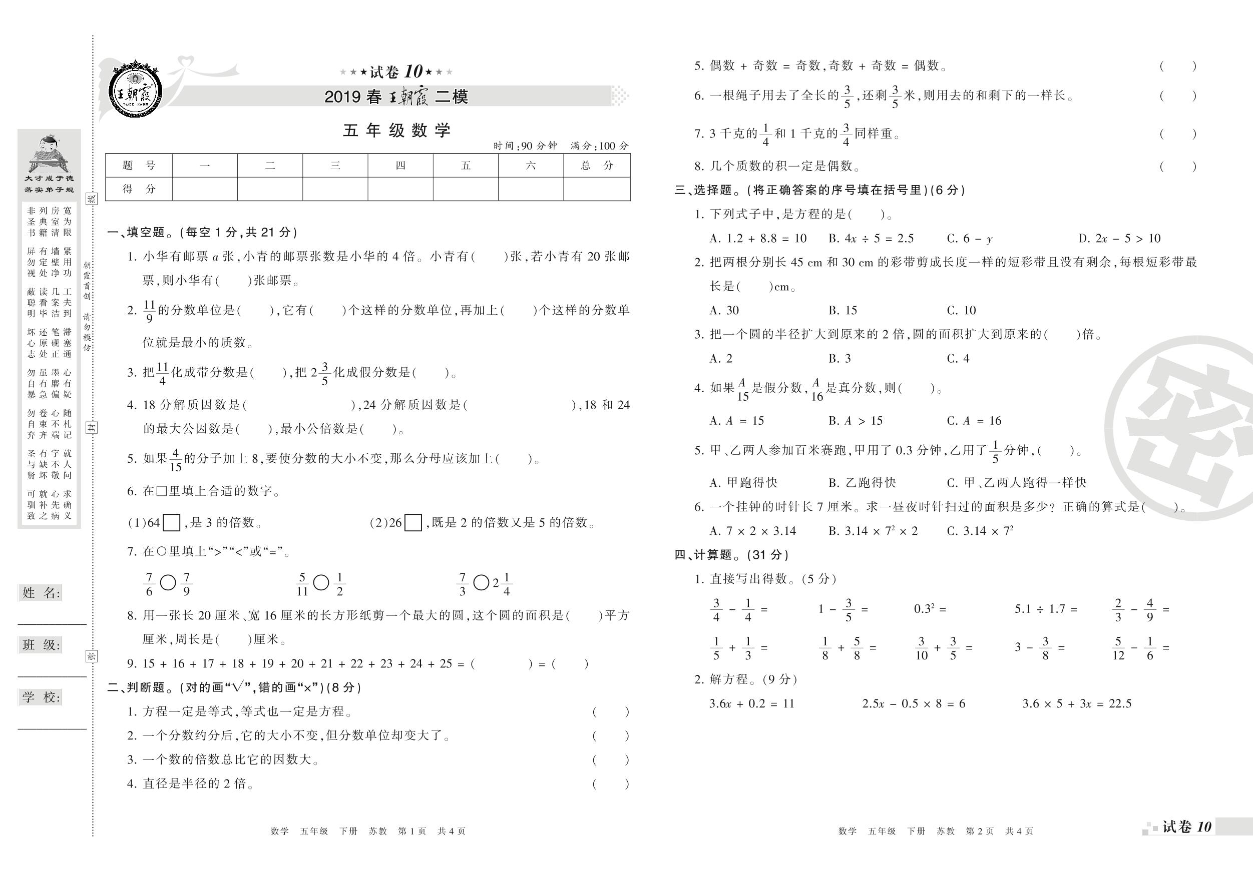 王朝霞期末模拟卷五年级下册数学(苏教版)_R210804172126【10】