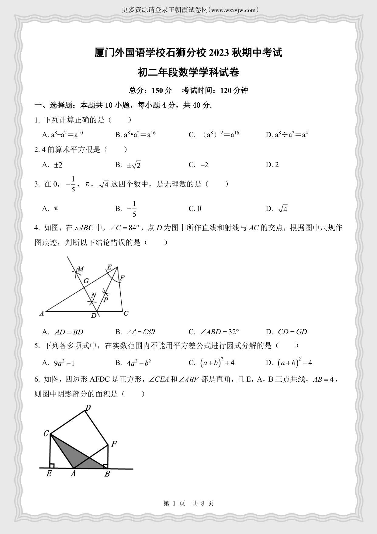 福建省厦门外国语学校石狮分校2023-2024学年第一学期期中试卷八年级数学(人教版)