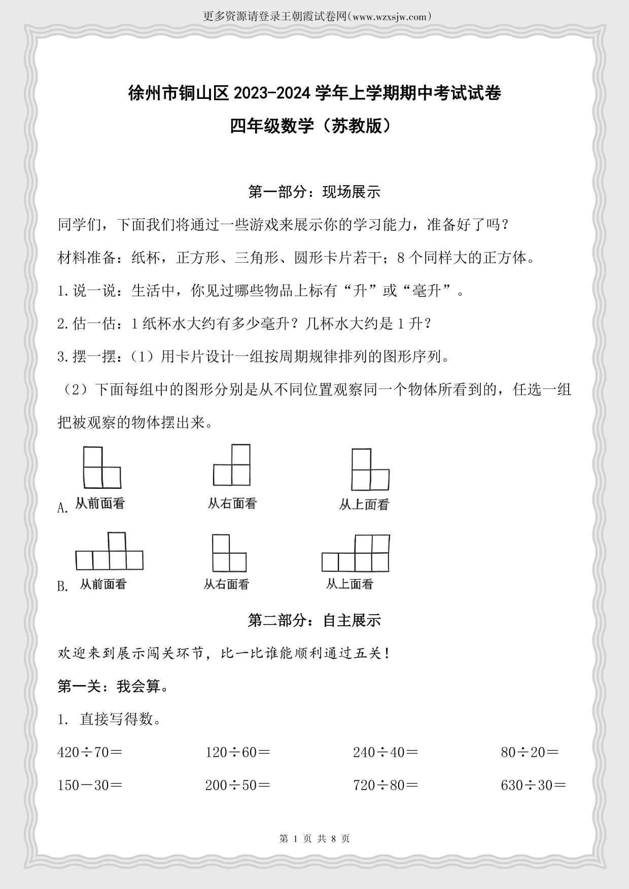江苏省徐州市铜山区2023-2024学年上学期期中考试试卷四年级数学(苏教版)_R240912181943149