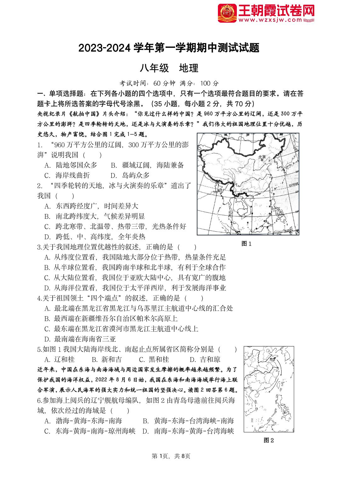 八年级地理人教版上册期中卷