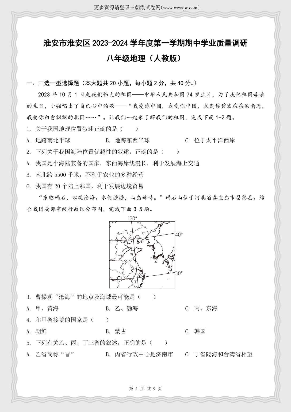 江苏省淮安市淮安区2023-2024学年度第一学期期中学业质量调研八年级地理(人教版)