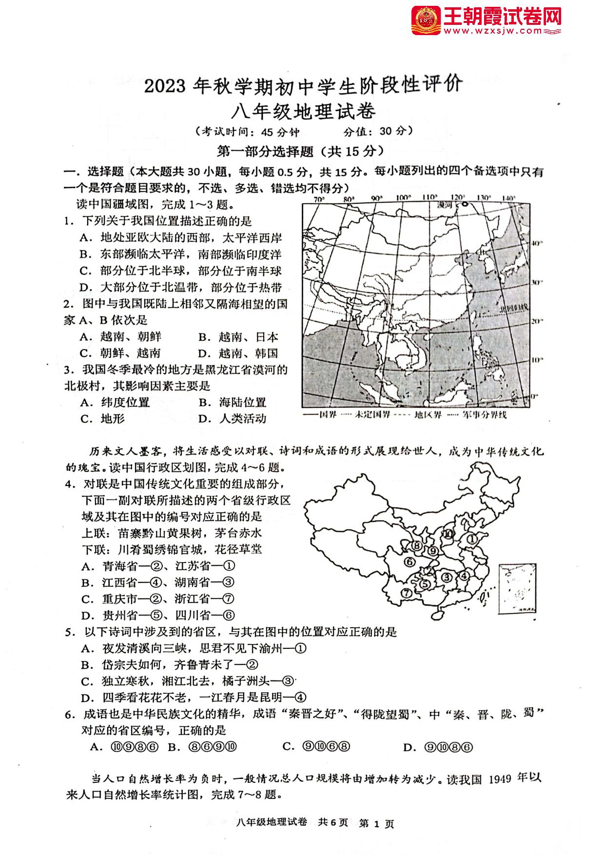 江苏省泰州市兴化市2023-2024学年上学期期中阶段性评价八年级地理(人教版)