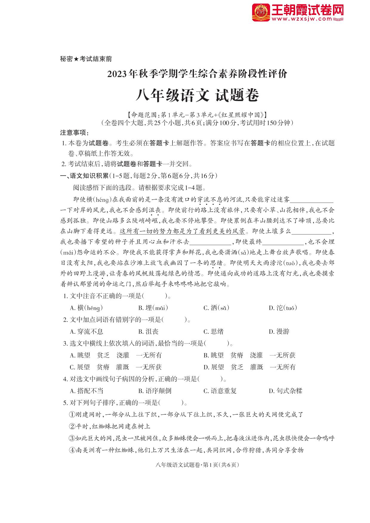 云南省昭通市永善县2023-2024学年上学期学生综合素质阶段性评价期中试题卷八年级语文(人教版)