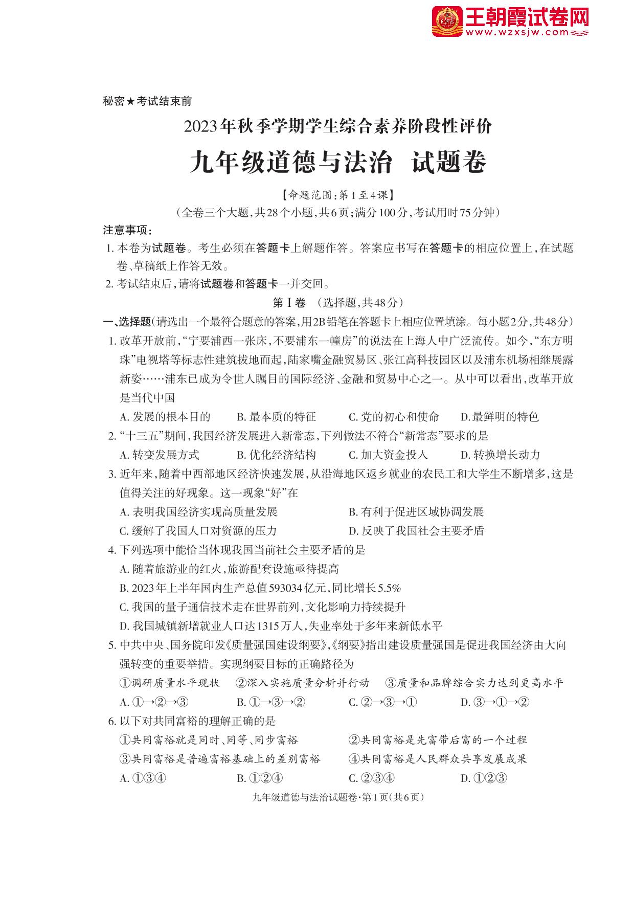 云南省昭通市永善县2023-2024学年上学期学生综合素质阶段性评价期中试题卷九年级道德与法治(人教版)
