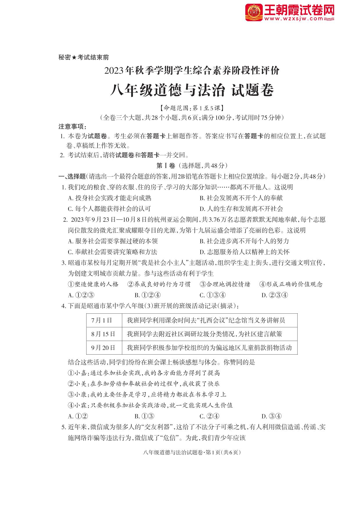 云南省昭通市永善县2023-2024学年上学期学生综合素质阶段性评价期中试题卷八年级道德与法治(人教版)