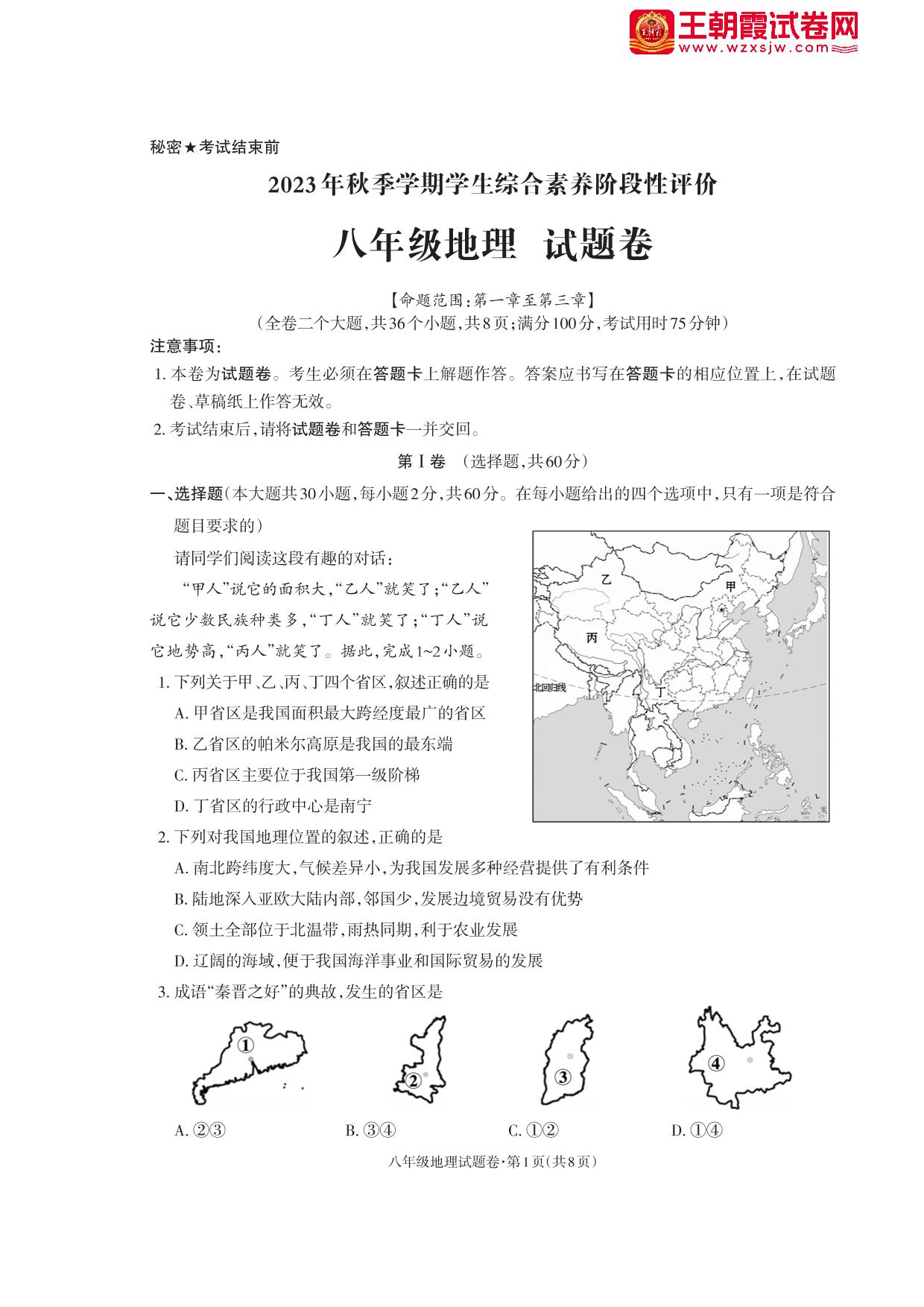 云南省昭通市永善县2023-2024学年上学期学生综合素质阶段性评价期中试题卷八年级地理(人教版)