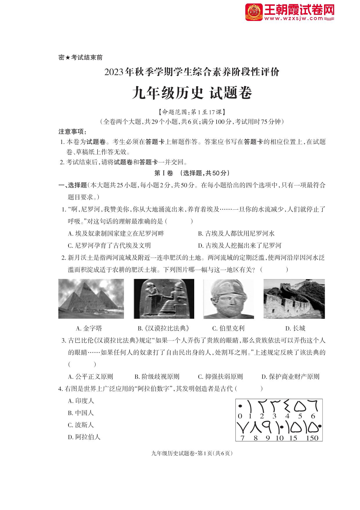 云南省昭通市永善县2023-2024学年上学期学生综合素质阶段性评价期中试题卷九年级历史(人教版)