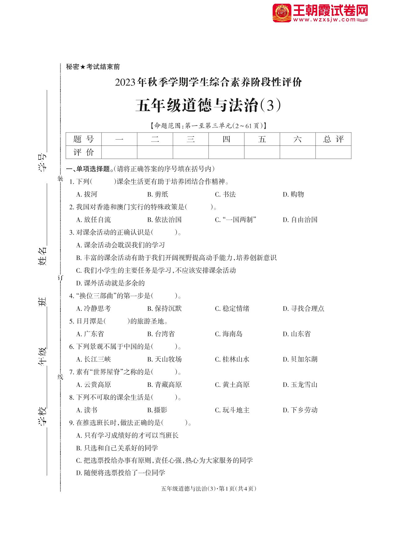 五年级道德与法治人教版上册期中卷