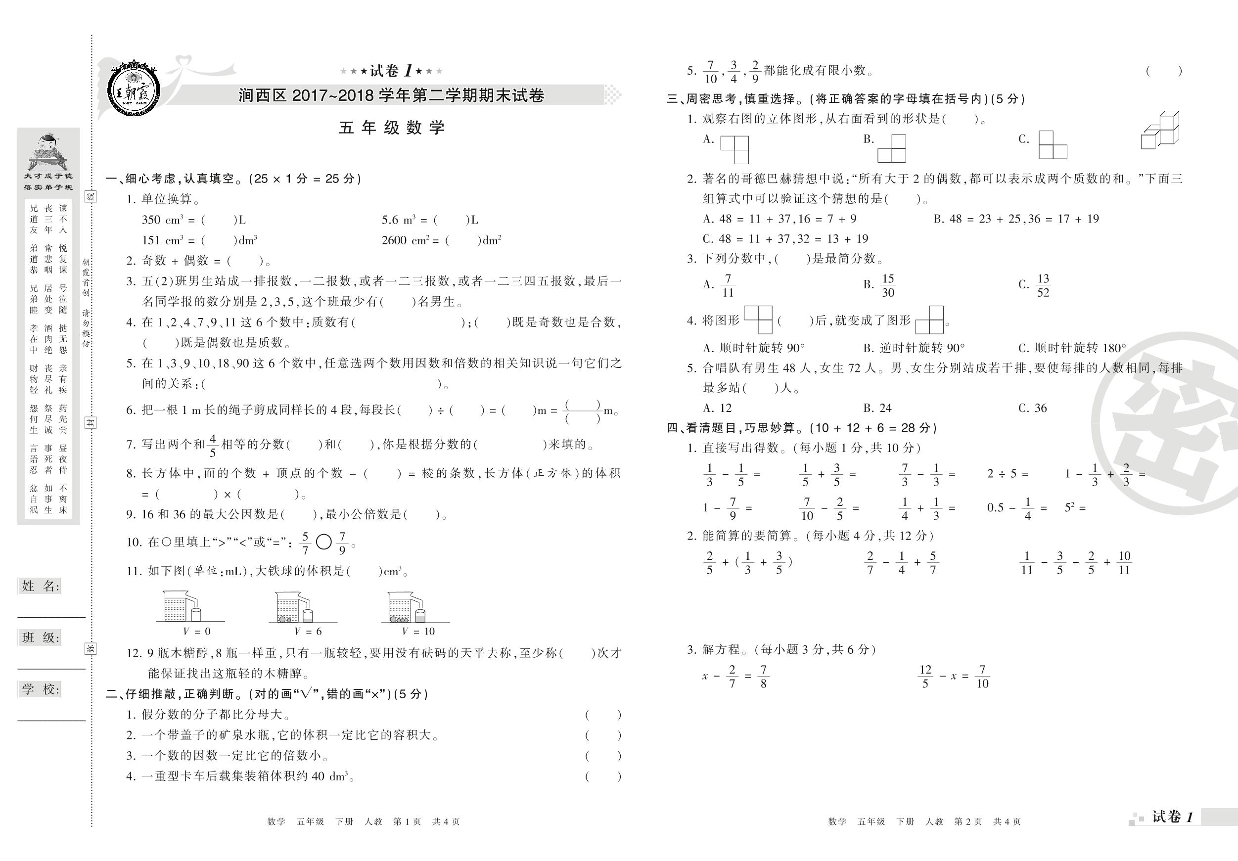 2017-2018学年第二学期洛阳市涧西区五年级数学试卷(人教版)【1】