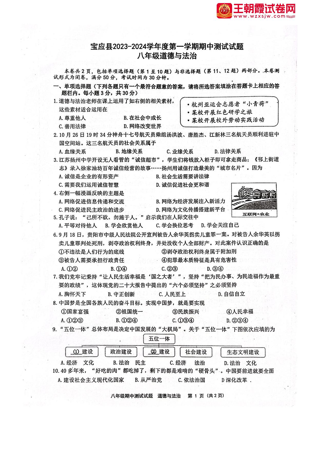 江苏省扬州市宝应县2023-2024学年度第一学期期中测试八年级道德与法治(人教版)