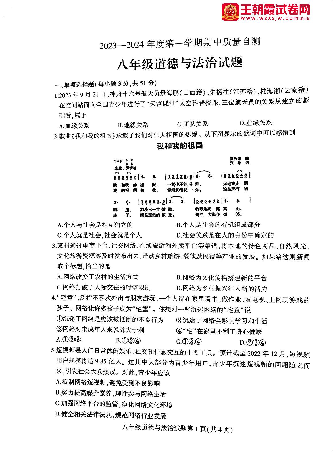 江苏省徐州市铜山区2023-2024学年度第一学期期中质量自测八年级道德与法治(人教版)
