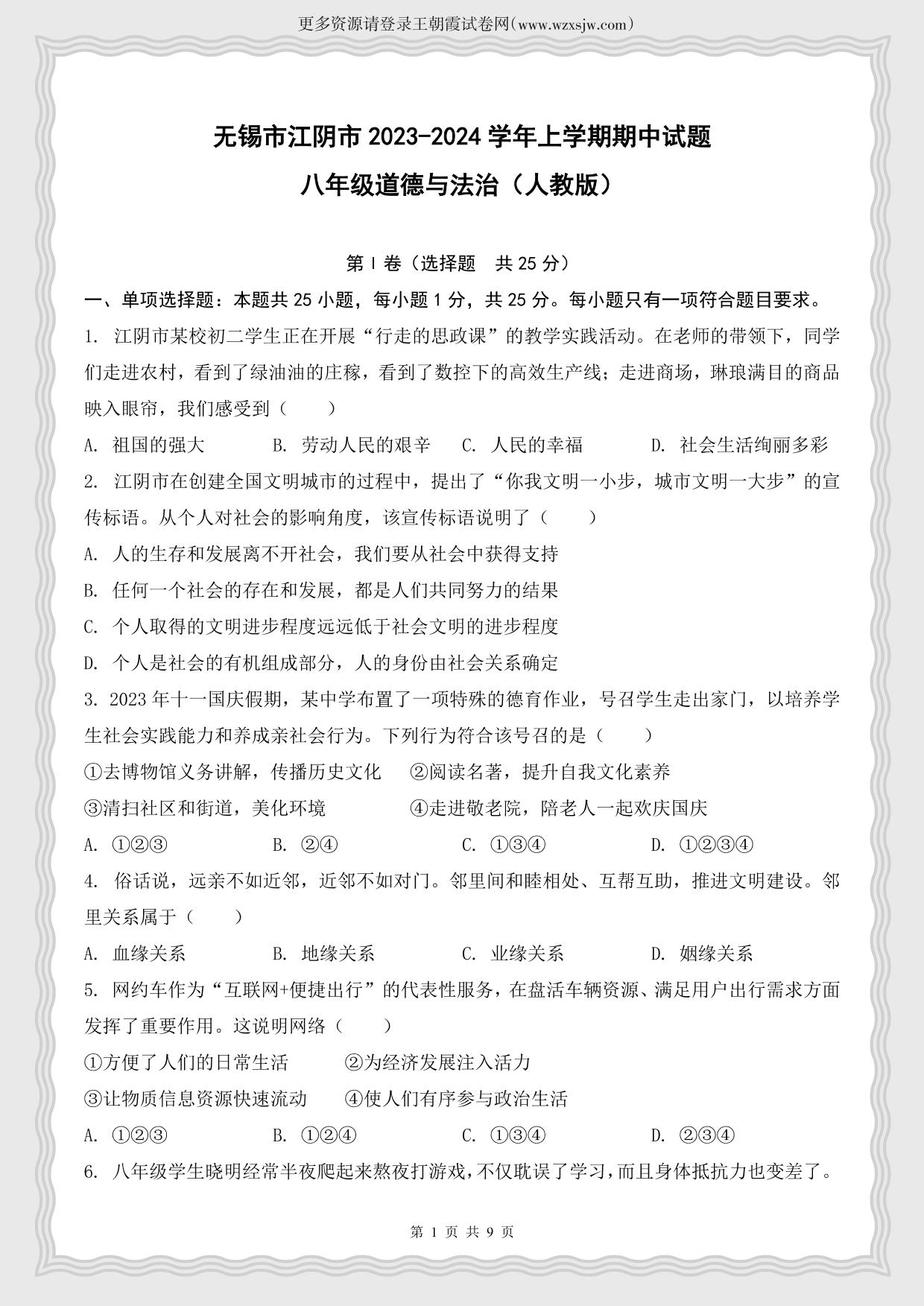 江苏省无锡市江阴市2023-2024学年上学期期中试题八年级道德与法治(人教版)