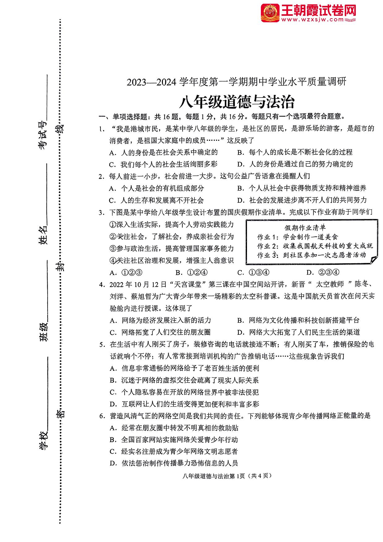 江苏省连云港市海宁中学2023-2024学年度第一学期期中学业水平质量调研八年级道德与法治(人教版)