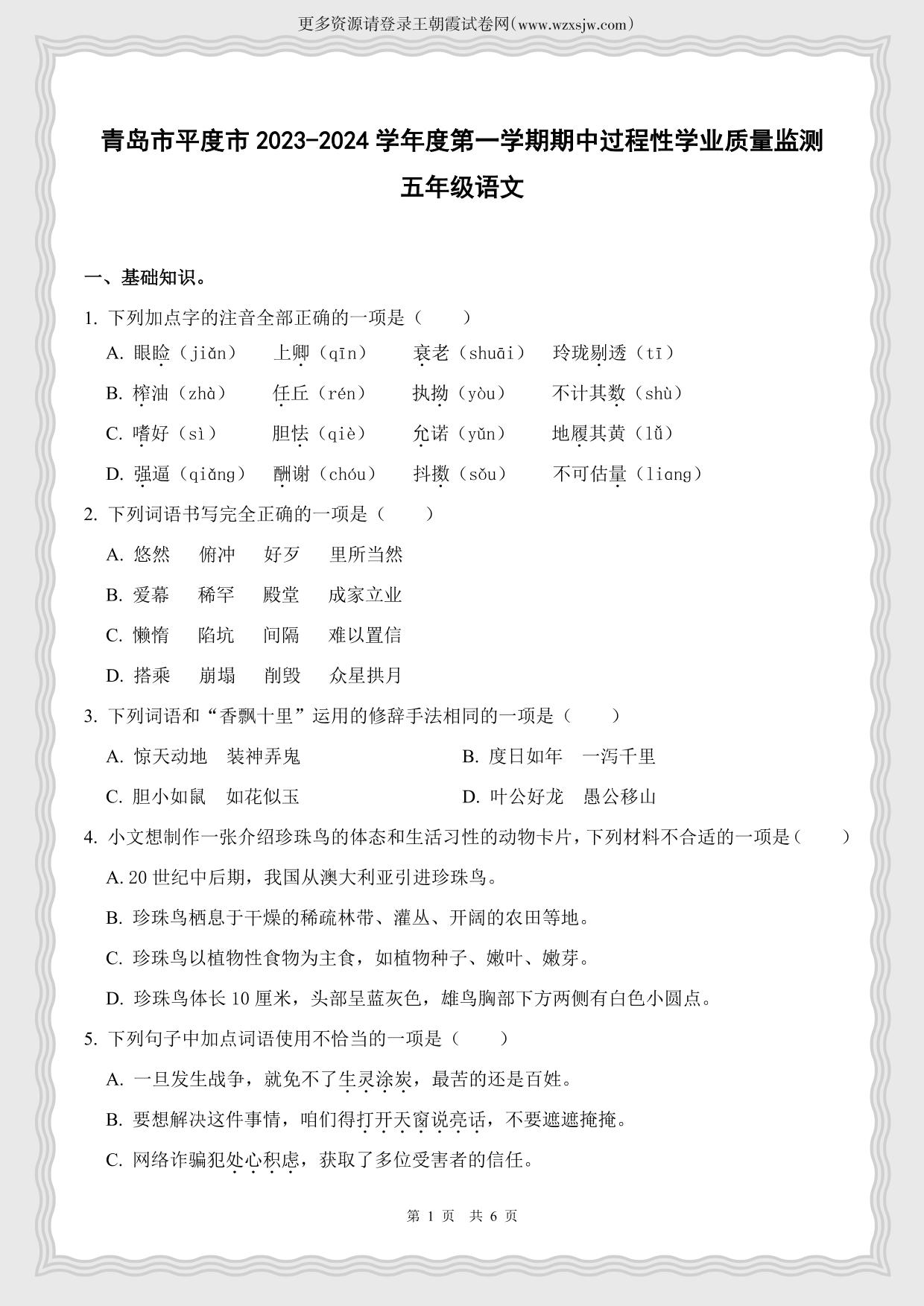 山东省青岛市平度市2023-2024学年度第一学期期中过程性学业质量监测五年级语文(人教版)