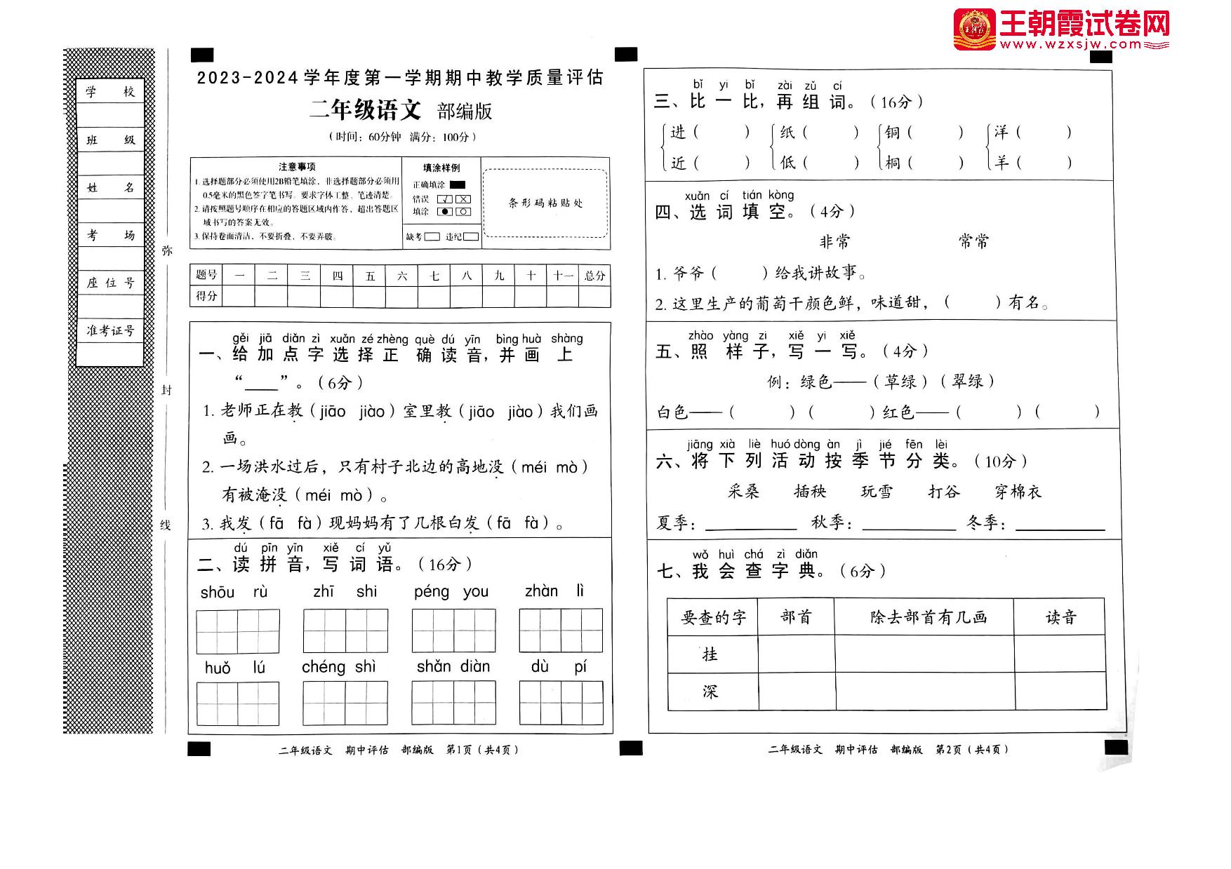 二年级语文人教版上册期中卷