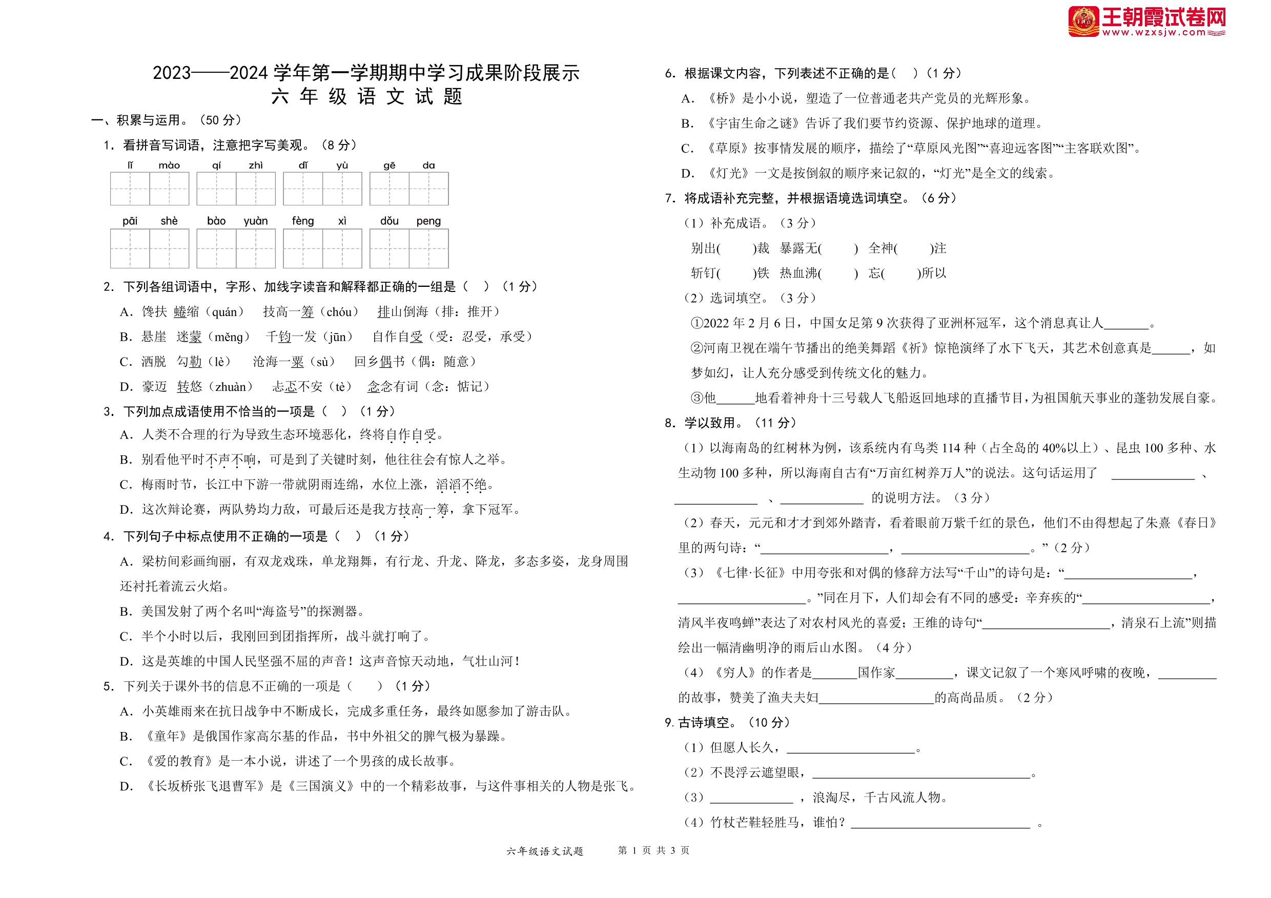 六年级语文人教版上册期中卷