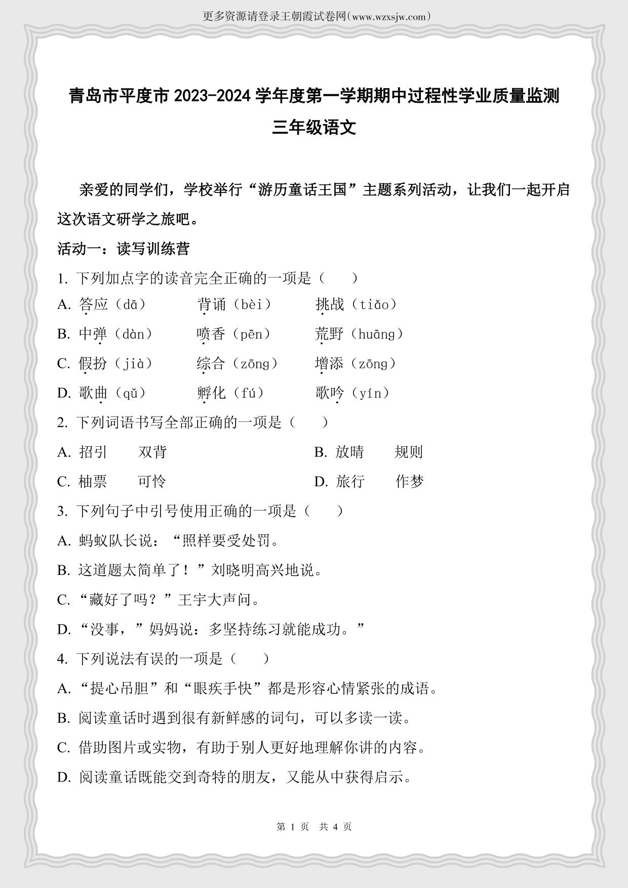 山东省青岛市平度市2023-2024学年度第一学期期中过程性学业质量监测三年级语文(人教版)