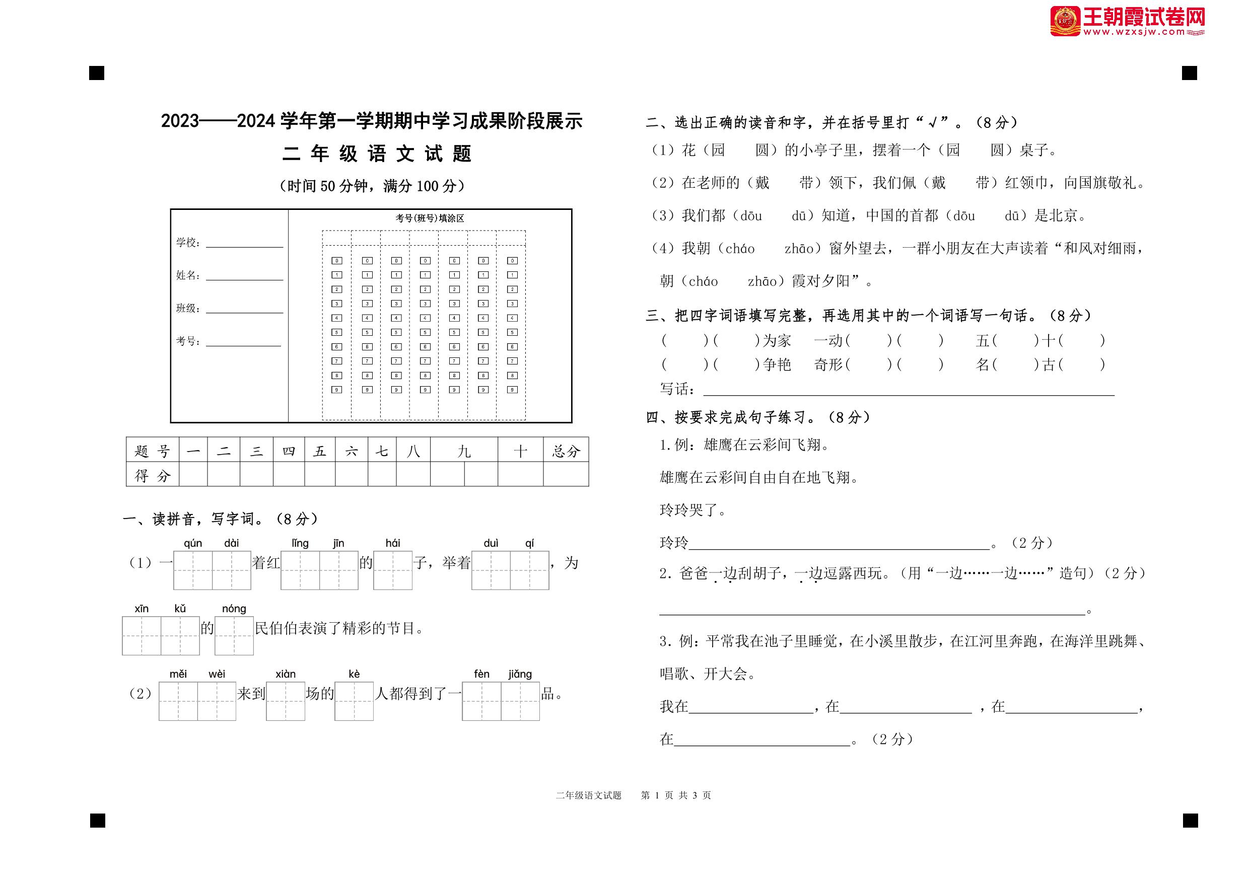 山东省德州市夏津县2023-2024学年第一学期期中学习成果阶段展示二年级语文(人教版)