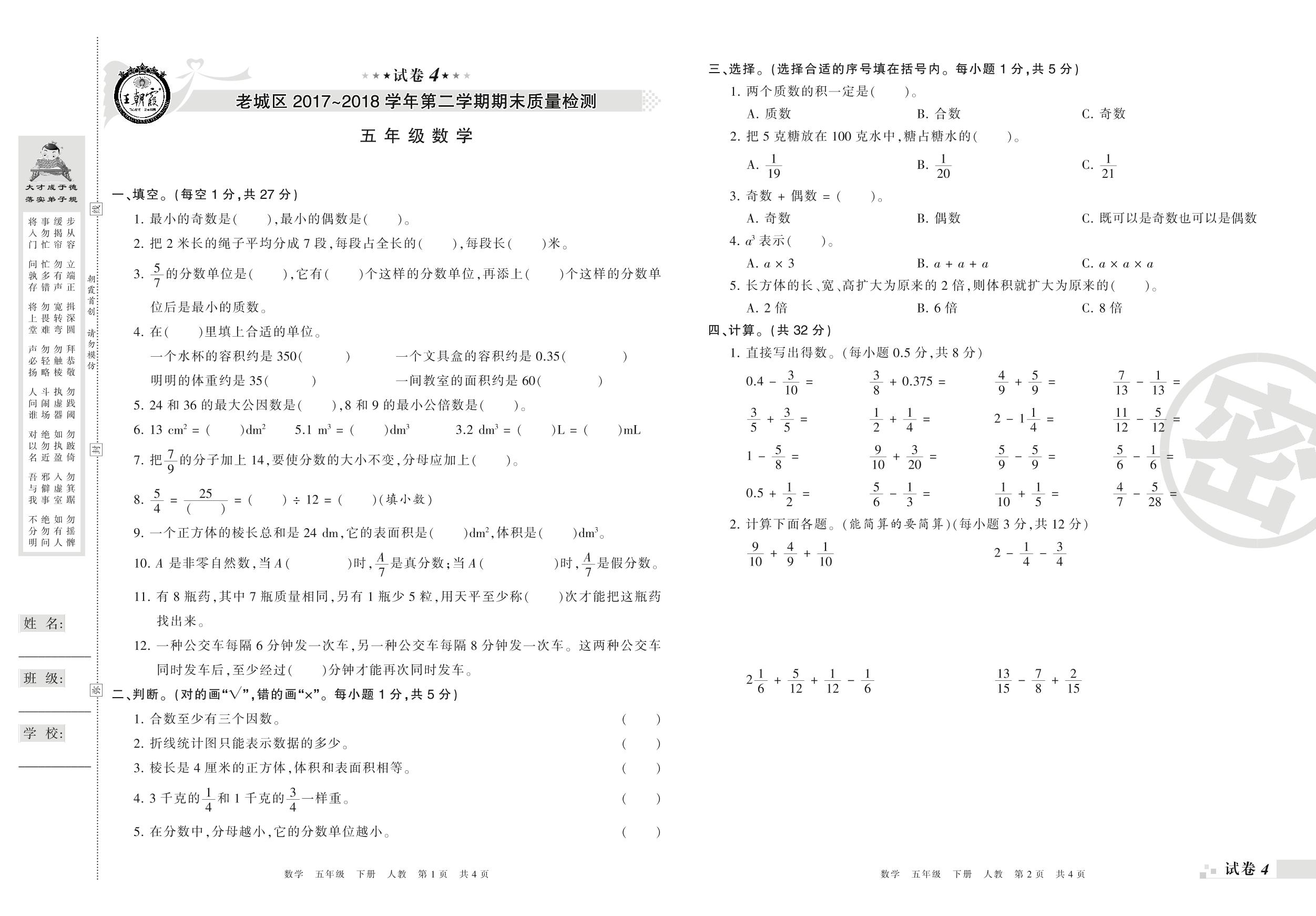2017-2018学年第二学期洛阳市老城区五年级数学试卷(人教版)【4】
