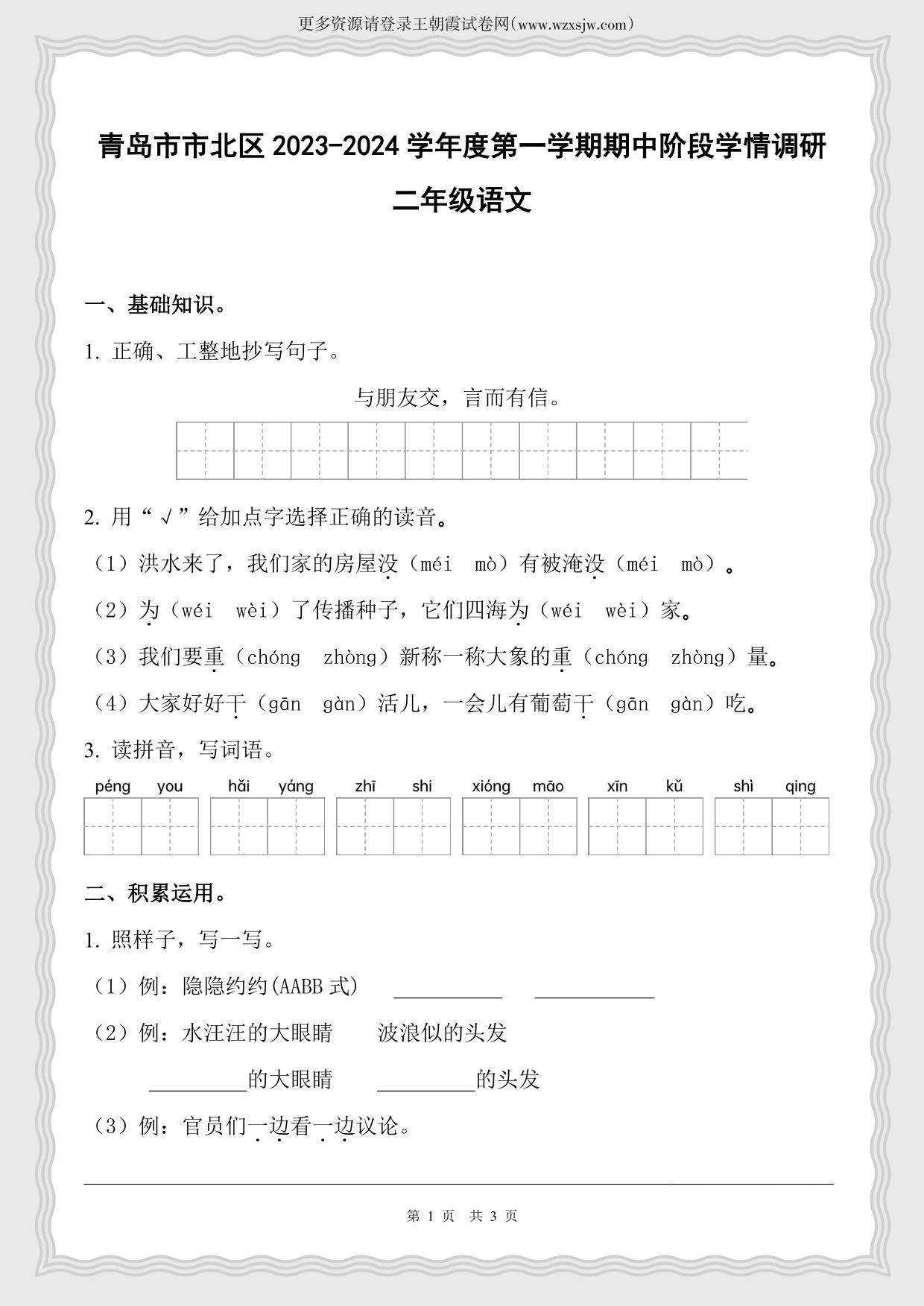 山东省青岛市市北区2023-2024学年度第一学期期中阶段学情调研二年级语文(人教版)