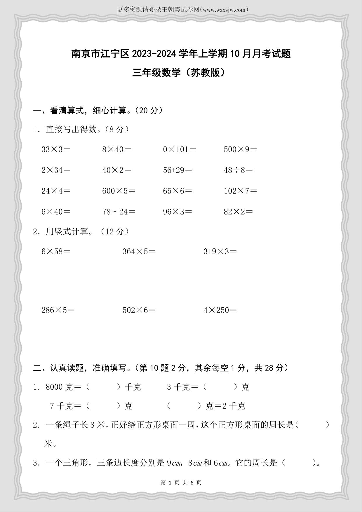 江苏省南京市江宁区2023-2024学年上学期10月月考试题三年级数学(苏教版)