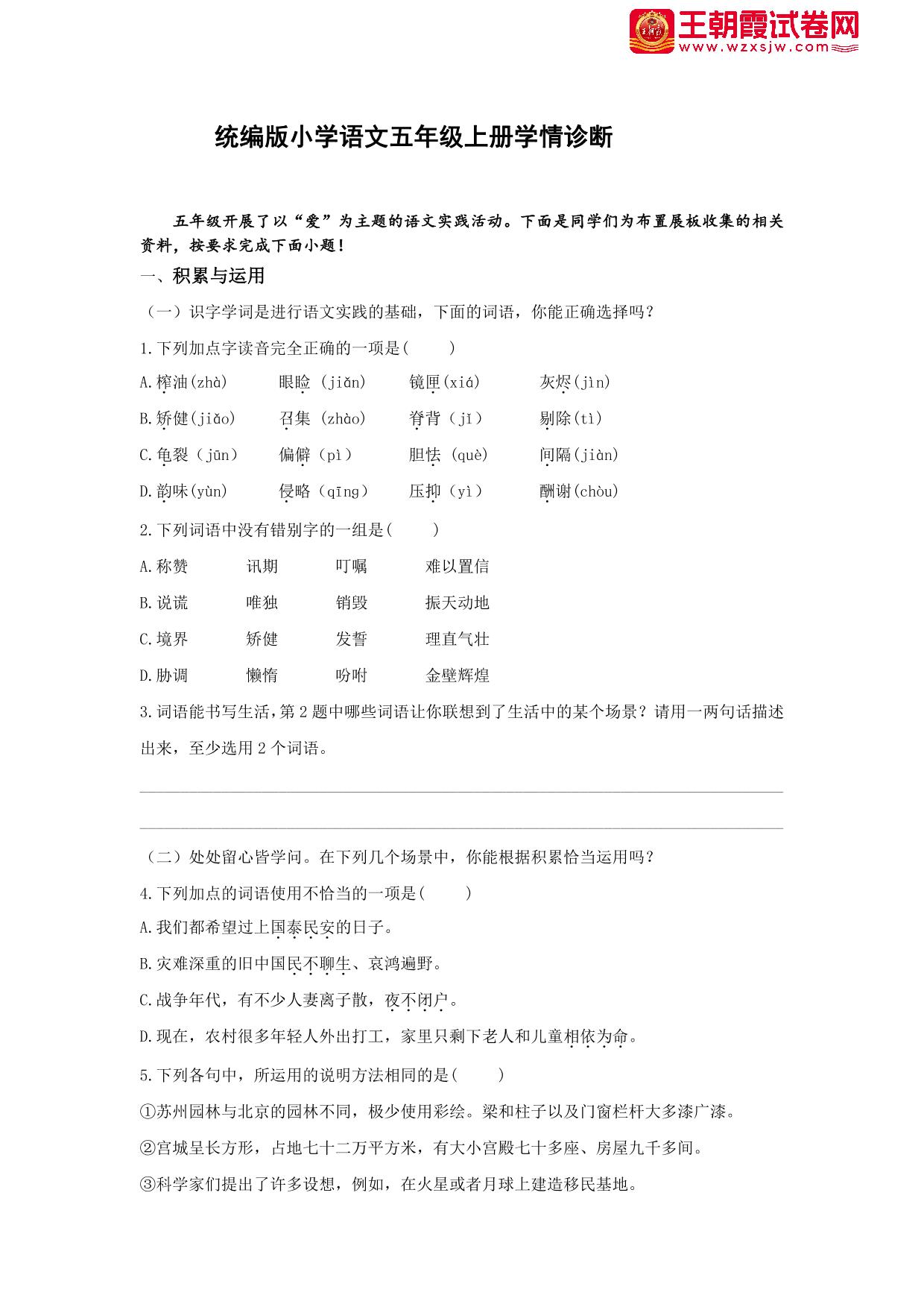 江苏省徐州经济技术开发区2023-2024学年上学期12月月考学情监测五年级语文(人教版)