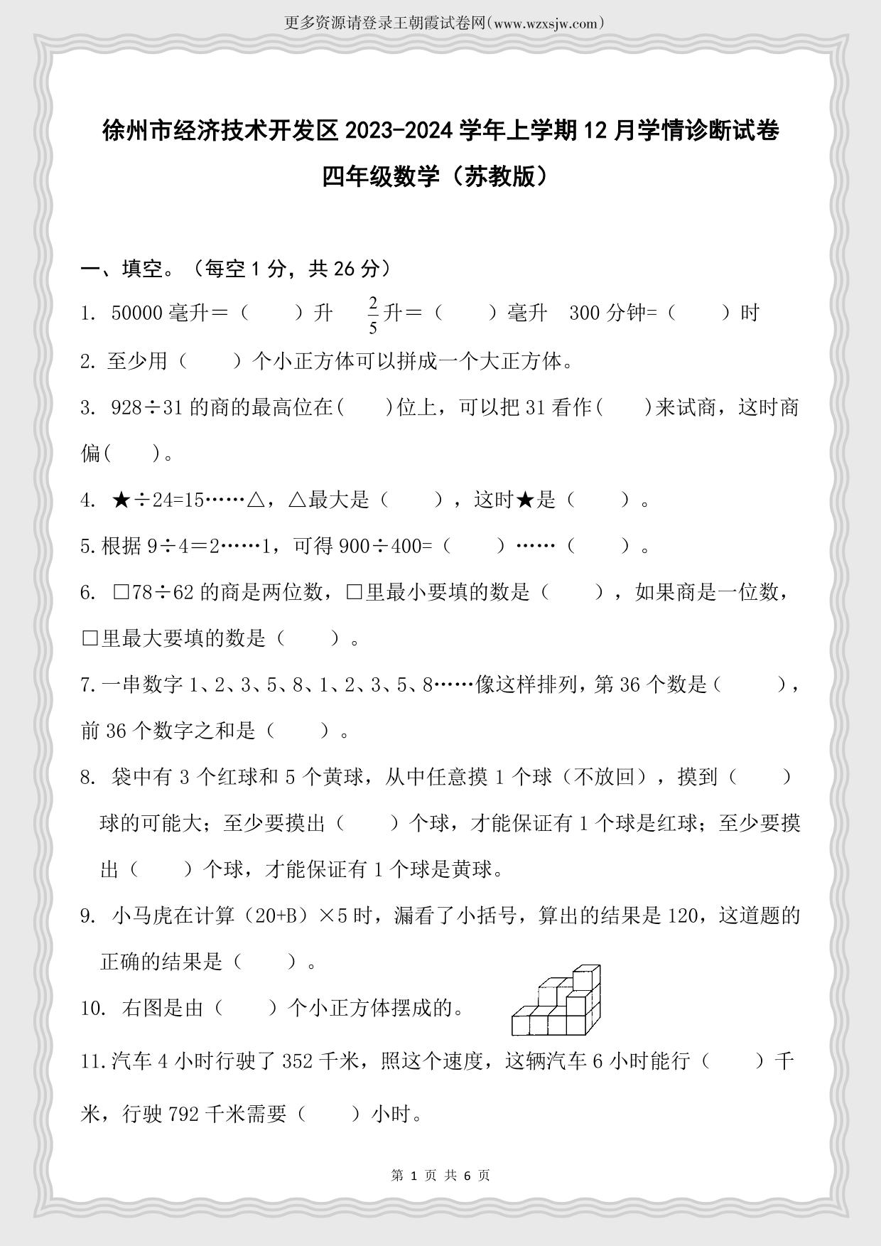 江苏省徐州市徐州经济技术开发区2023-2024学年上学期12月(月考)学情诊断试卷四年级数学(苏教版)