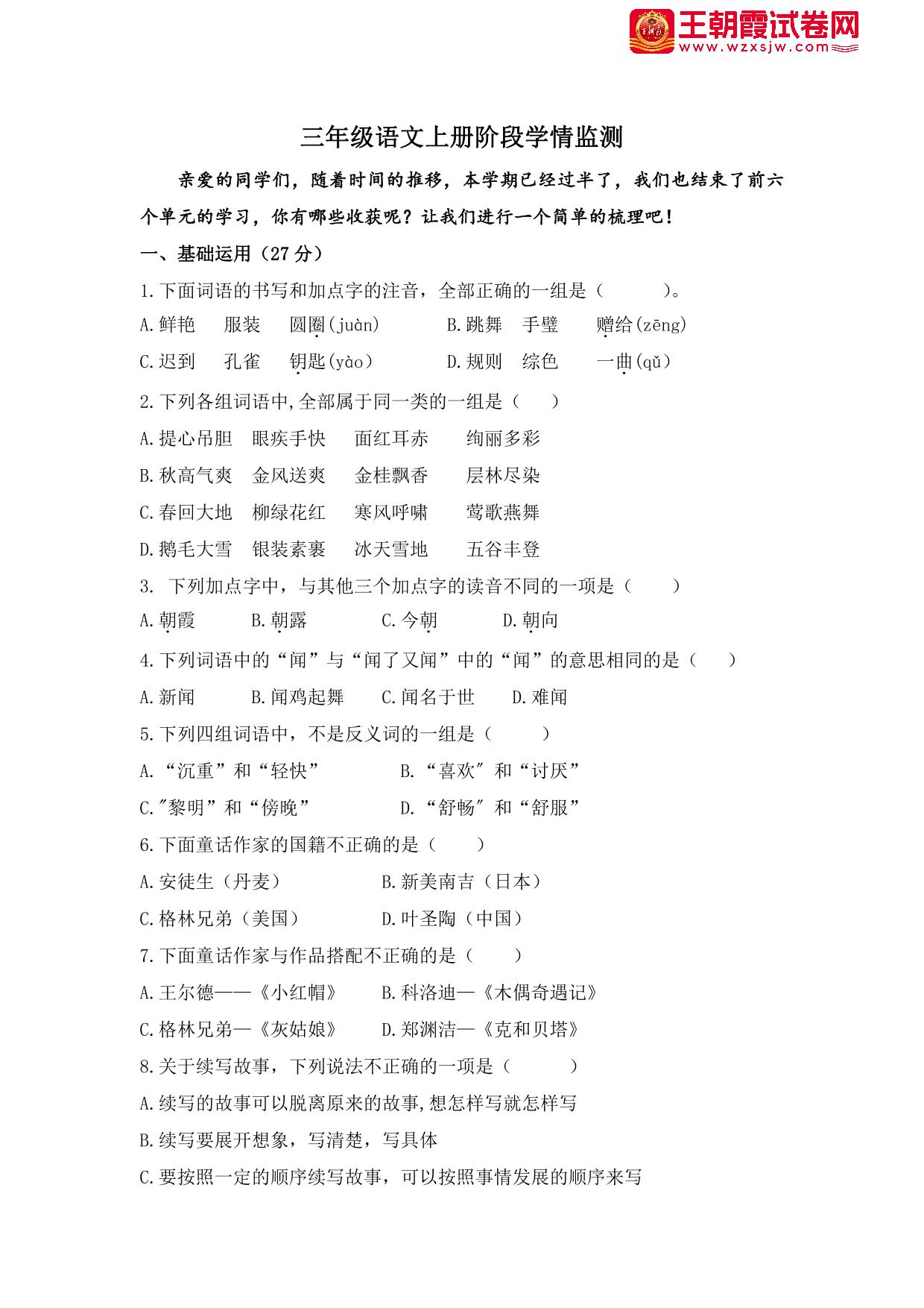 三年级语文人教版上册月考卷