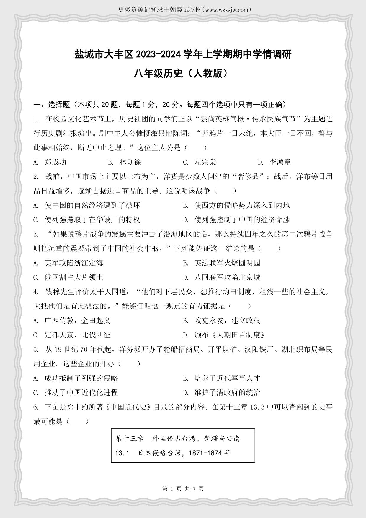 江苏省盐城市大丰区2023-2024学年上学期期中学情调研八年级历史(人教版)