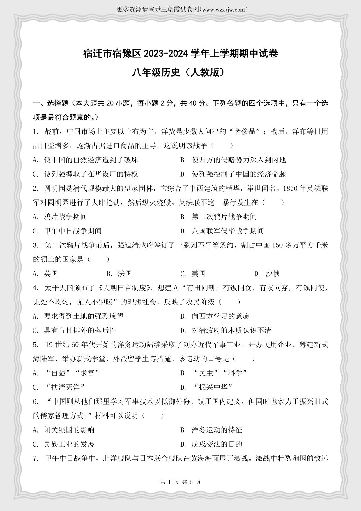 江苏省宿迁市宿豫区2023-2024学年上学期期中试卷八年级历史(人教版)