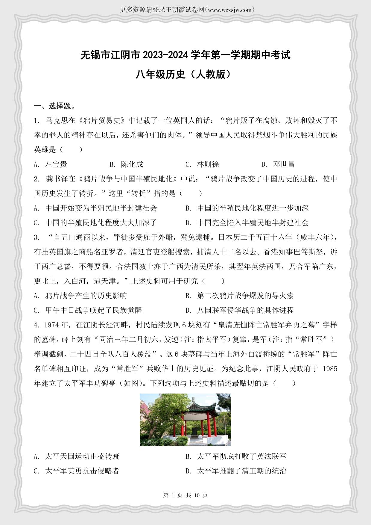江苏省无锡市江阴市2023-2024学年第一学期期中考试八年级历史(人教版)