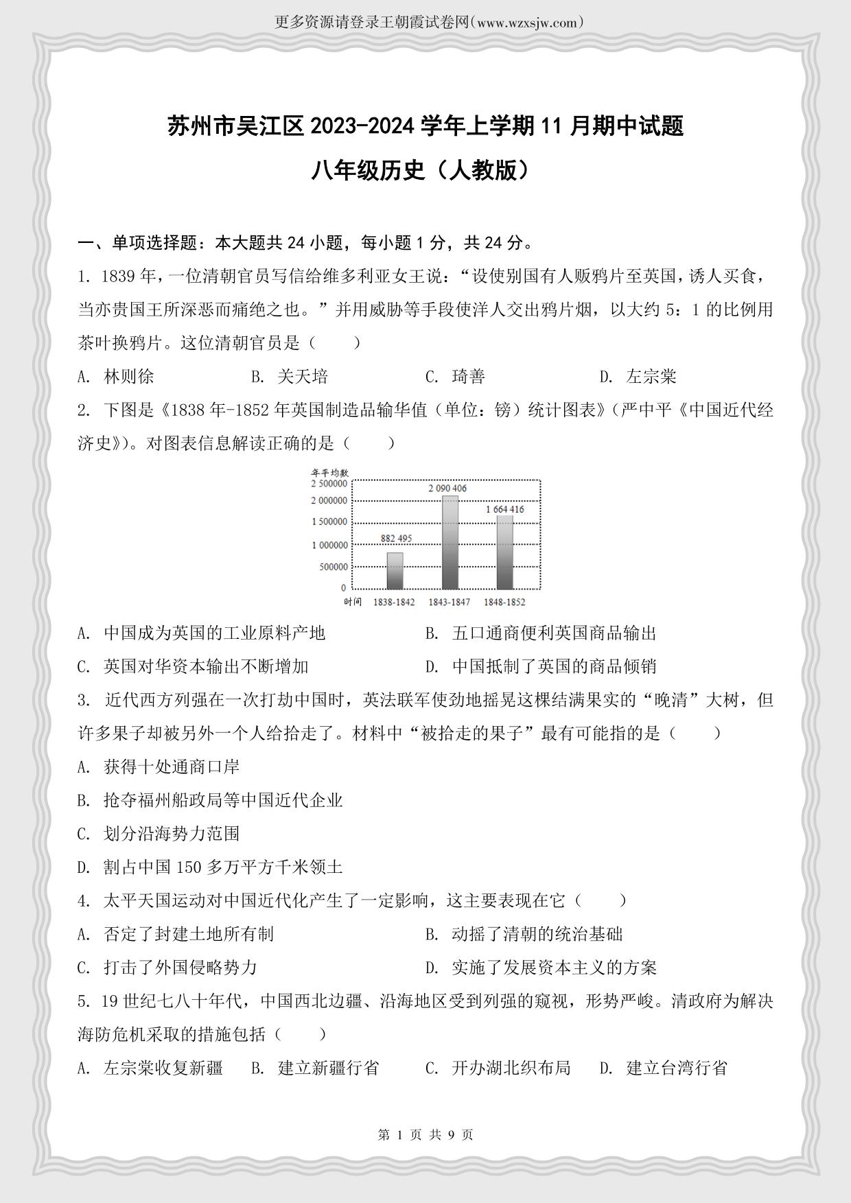 江苏省苏州市吴江区2023-2024学年上学期11月期中试题八年级历史(人教版)