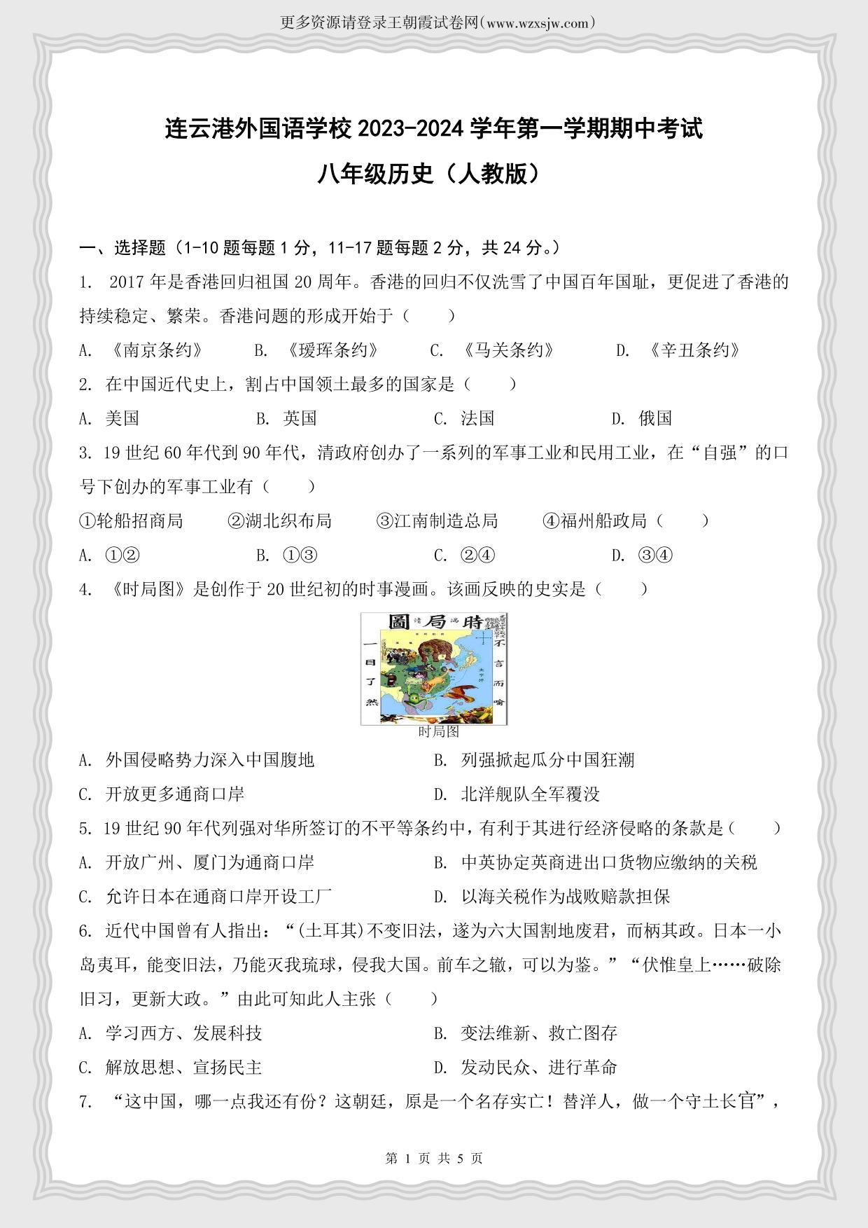 江苏省连云港市外国语学校2023-2024学年第一学期期中考试八年级历史(人教版)