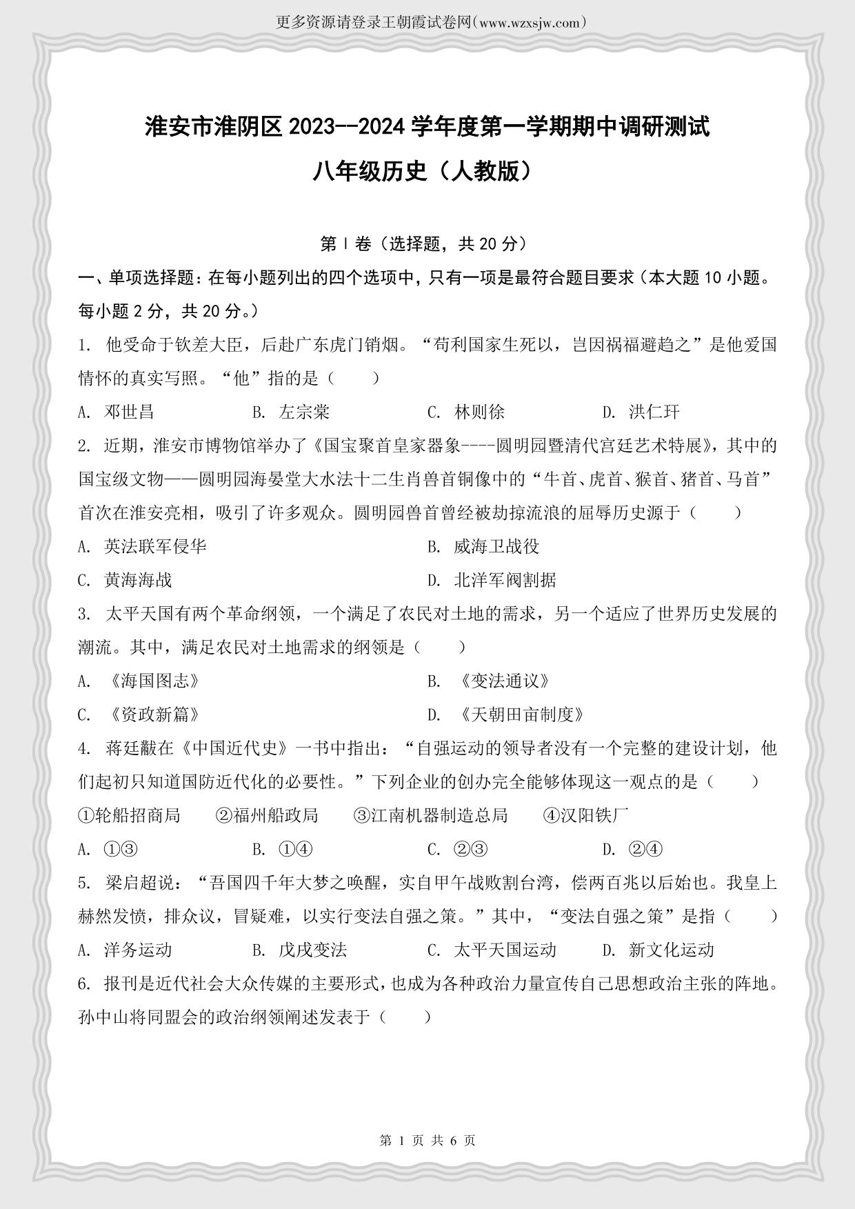 江苏省淮安市淮阴区2023-2024学年度第一学期期中调研测试八年级历史(人教版)