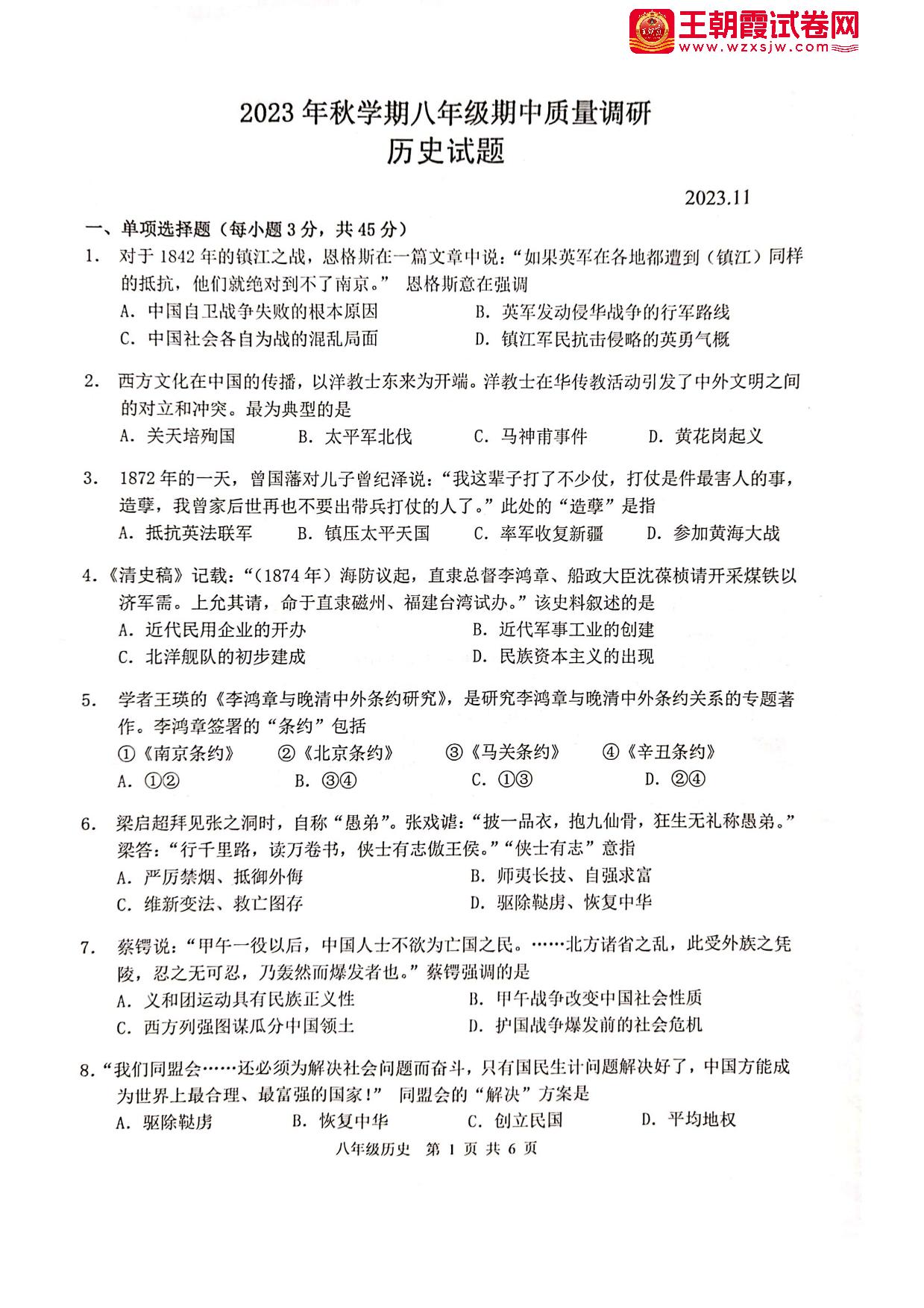 江苏省常州市金坛区2023-2024学年上学期期中质量调研八年级历史(人教版)