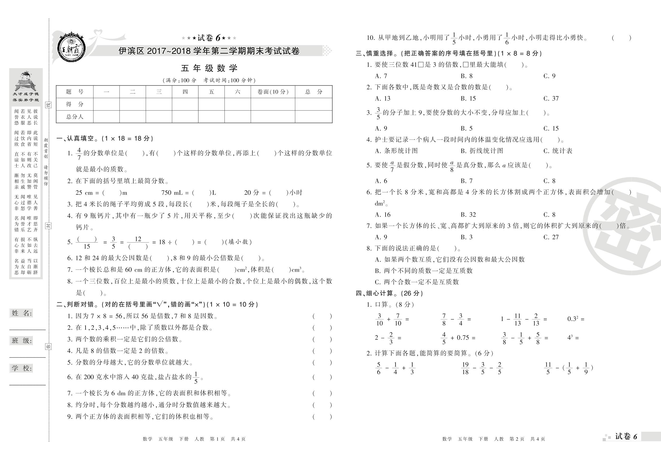 2017-2018学年第二学期洛阳市伊滨区五年级数学试卷(人教版)【6】
