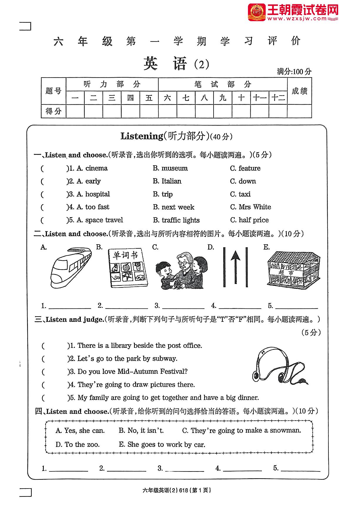六年级英语人教PEP版(三起始)上册期中卷