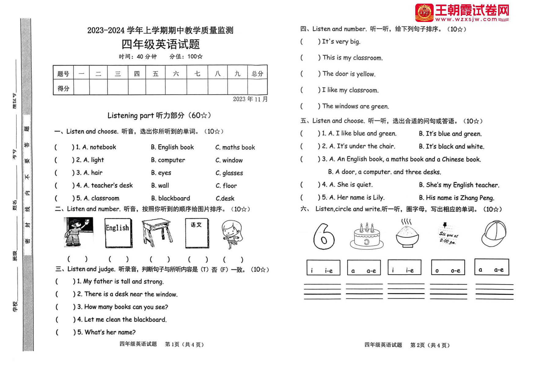 山东省临沂市临沭县2023-2024学年上学期期中教学质量监测四年级英语(人教PEP版)【无听力音频】