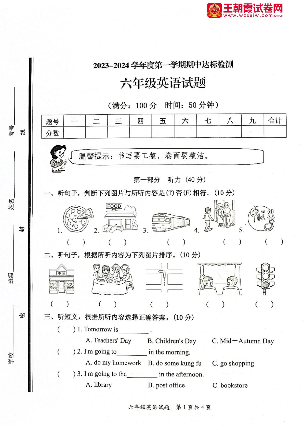 山东省枣庄市市中区2023-2024学年度第一学期期中达标检测六年级英语(人教PEP版)