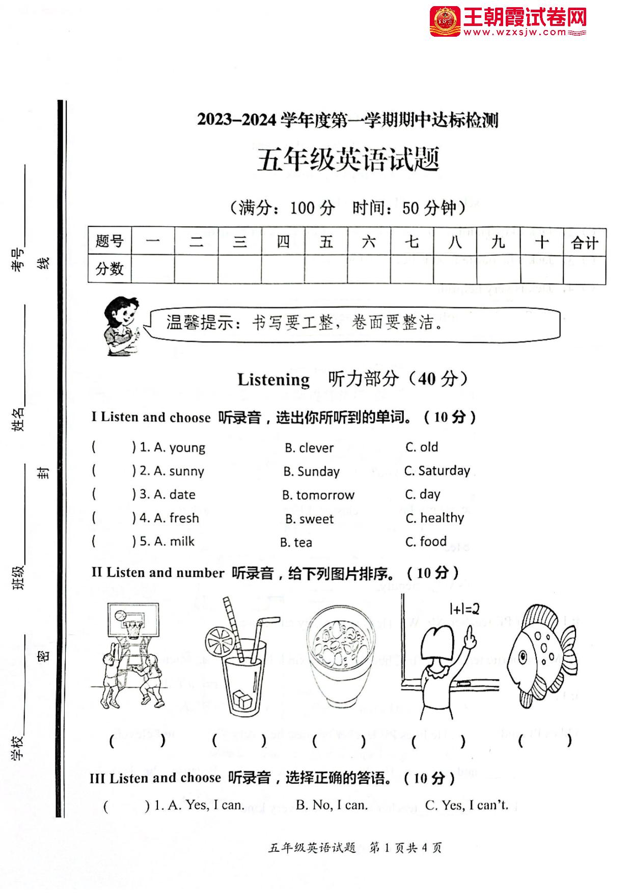 山东省枣庄市市中区2023-2024学年度第一学期期中达标检测五年级英语(人教PEP版)