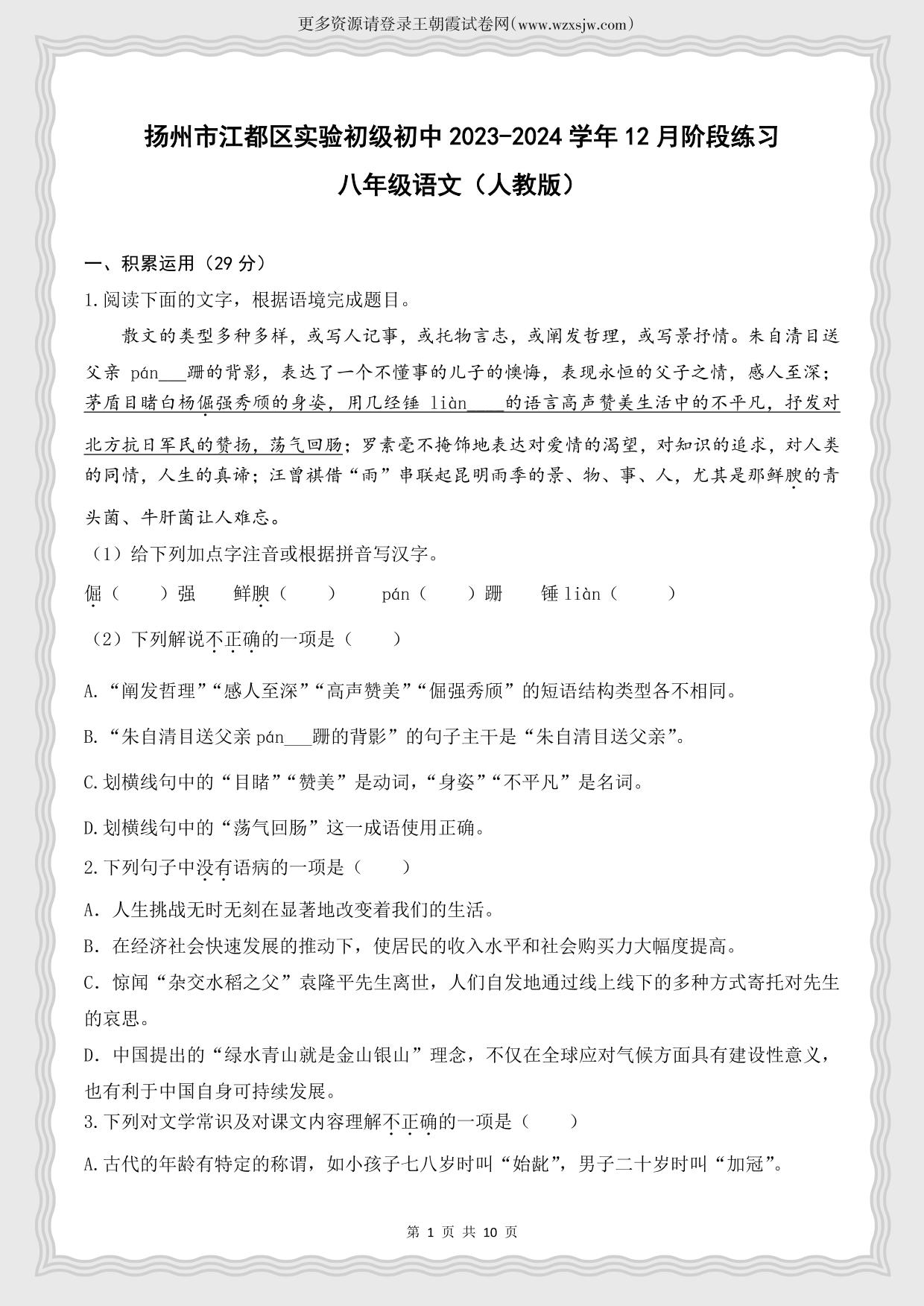 江苏省扬州市江都区实验初级中学2023-2024学年上学期12月月考阶段练习八年级语文(人教版)
