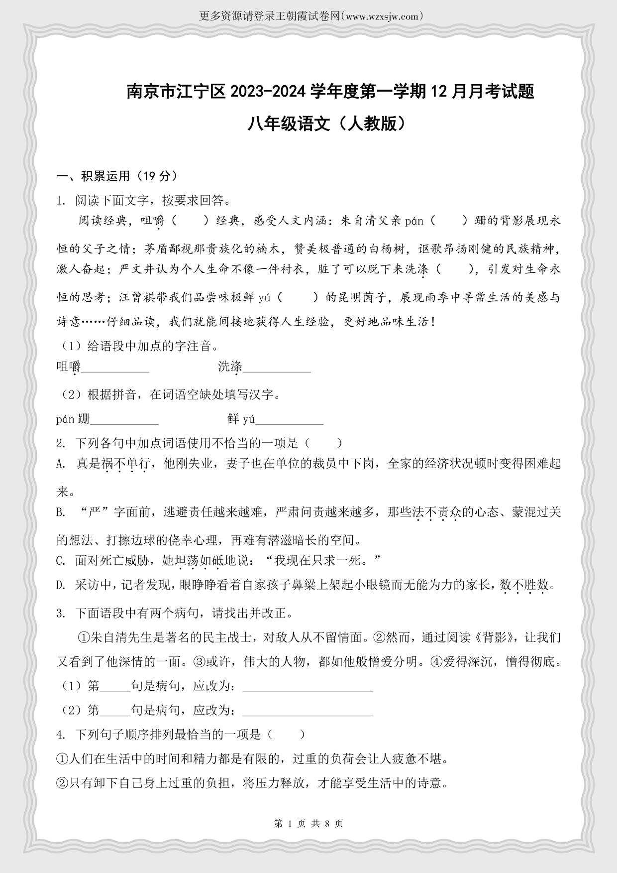 江苏省南京市江宁区2023-2024学年度第一学期12月月考试题八年级语文(人教版)