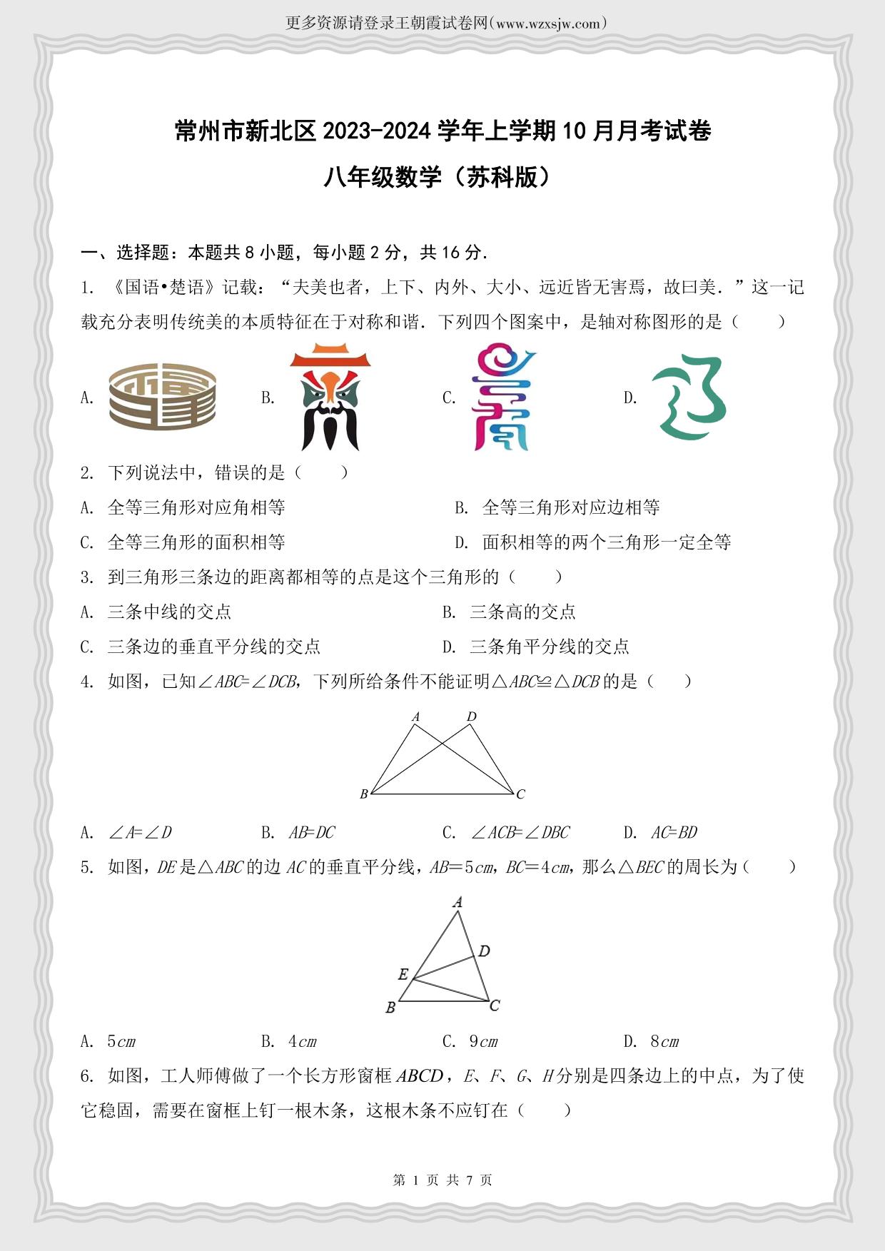 江苏省常州市新北区2023-2024学年上学期10月考试卷八年级数学(苏科版)