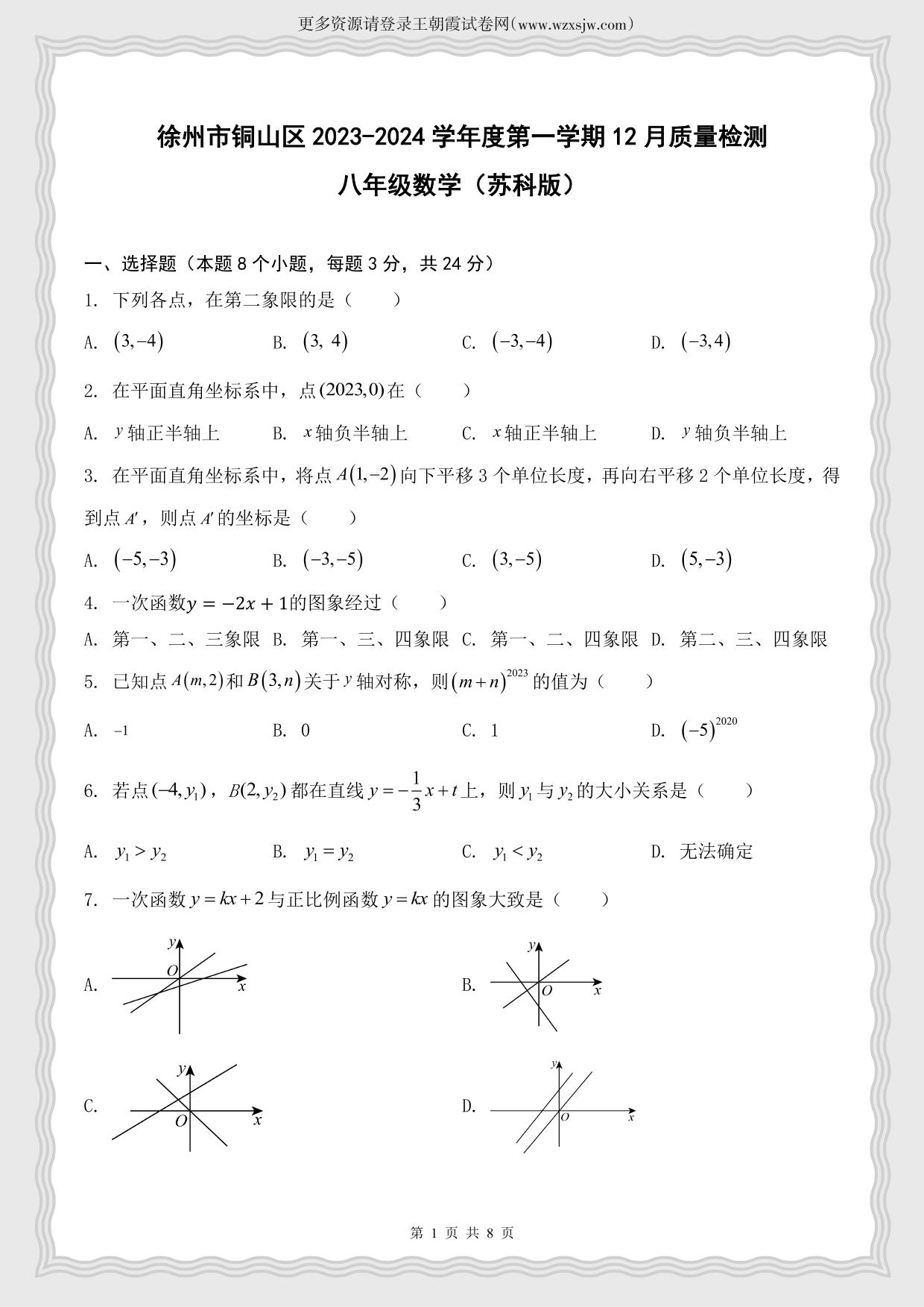 江苏省徐州市铜山区2023-2024学年度第一学期12月考质量检测八年级数学(苏科版)
