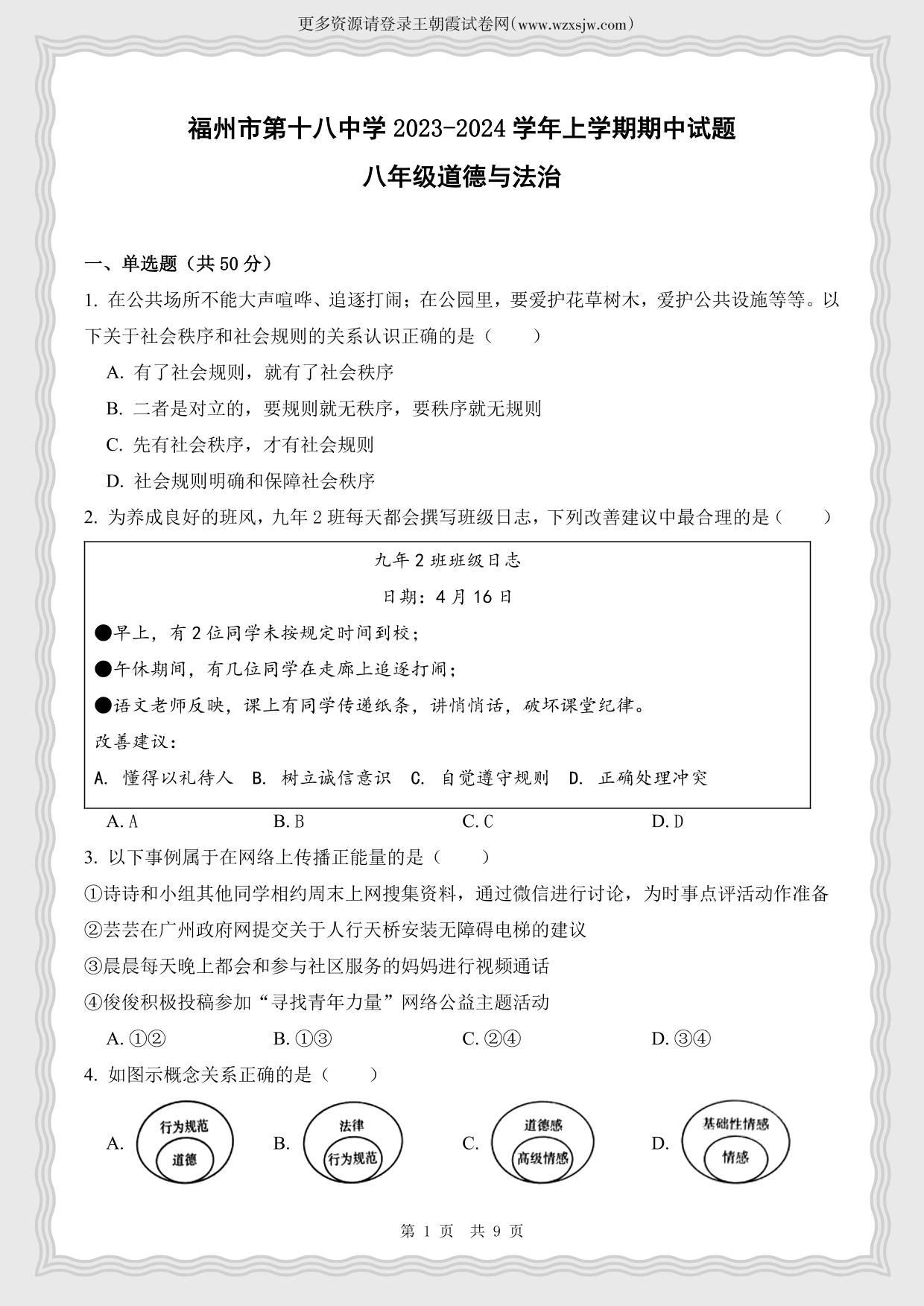 福建省福州市第十八中学2023-2024学年第一学期期中试题八年级道德与法治(人教版)