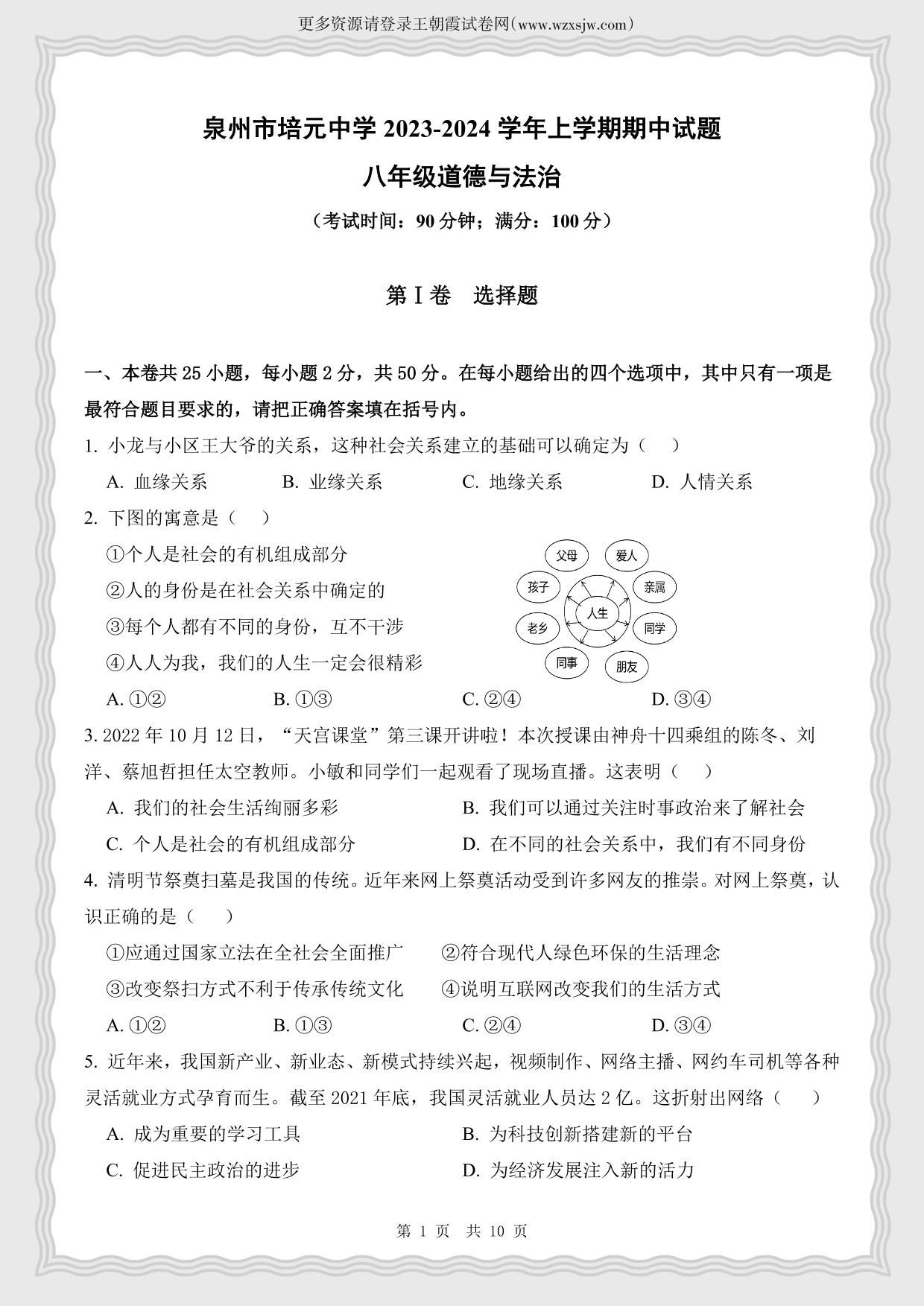 福建省泉州市培元中学2023-2024学年第一学期期中试题八年级道德与法治(人教版)