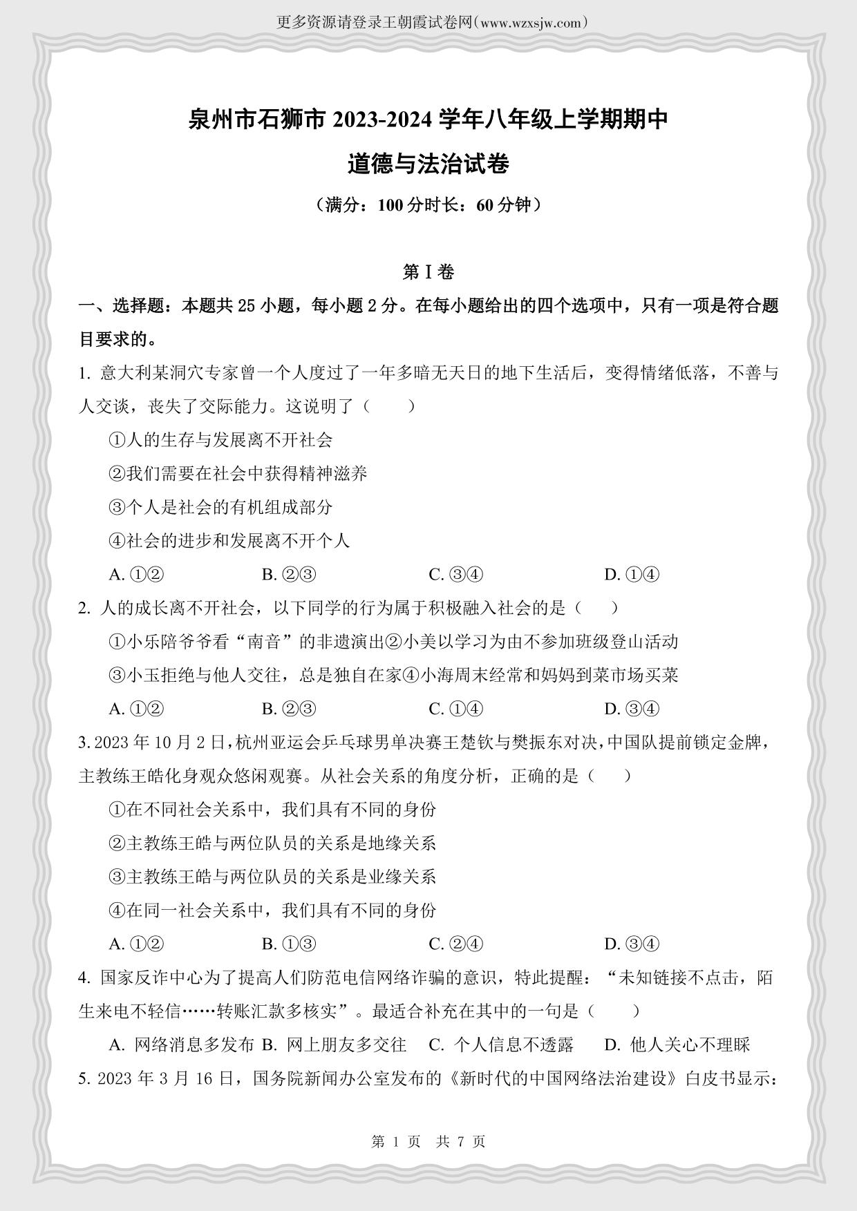 福建省泉州市石狮市2023-2024学年第一学期期中试卷八年级道德与法治(人教版)