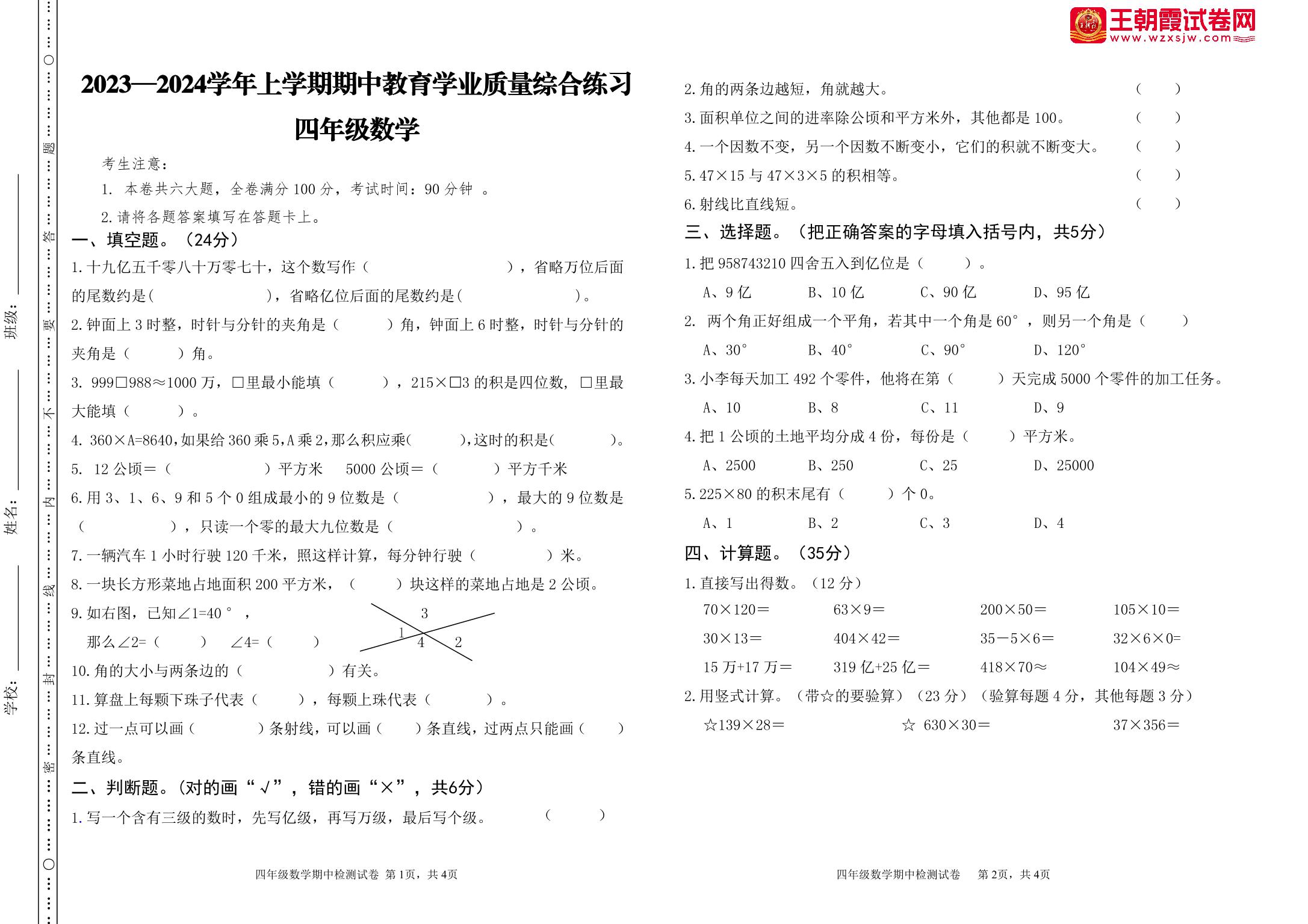 云南省楚雄彝族自治州楚雄市2023-2024学年上学期期中教育学业质量综合练习试卷四年级数学(人教版)