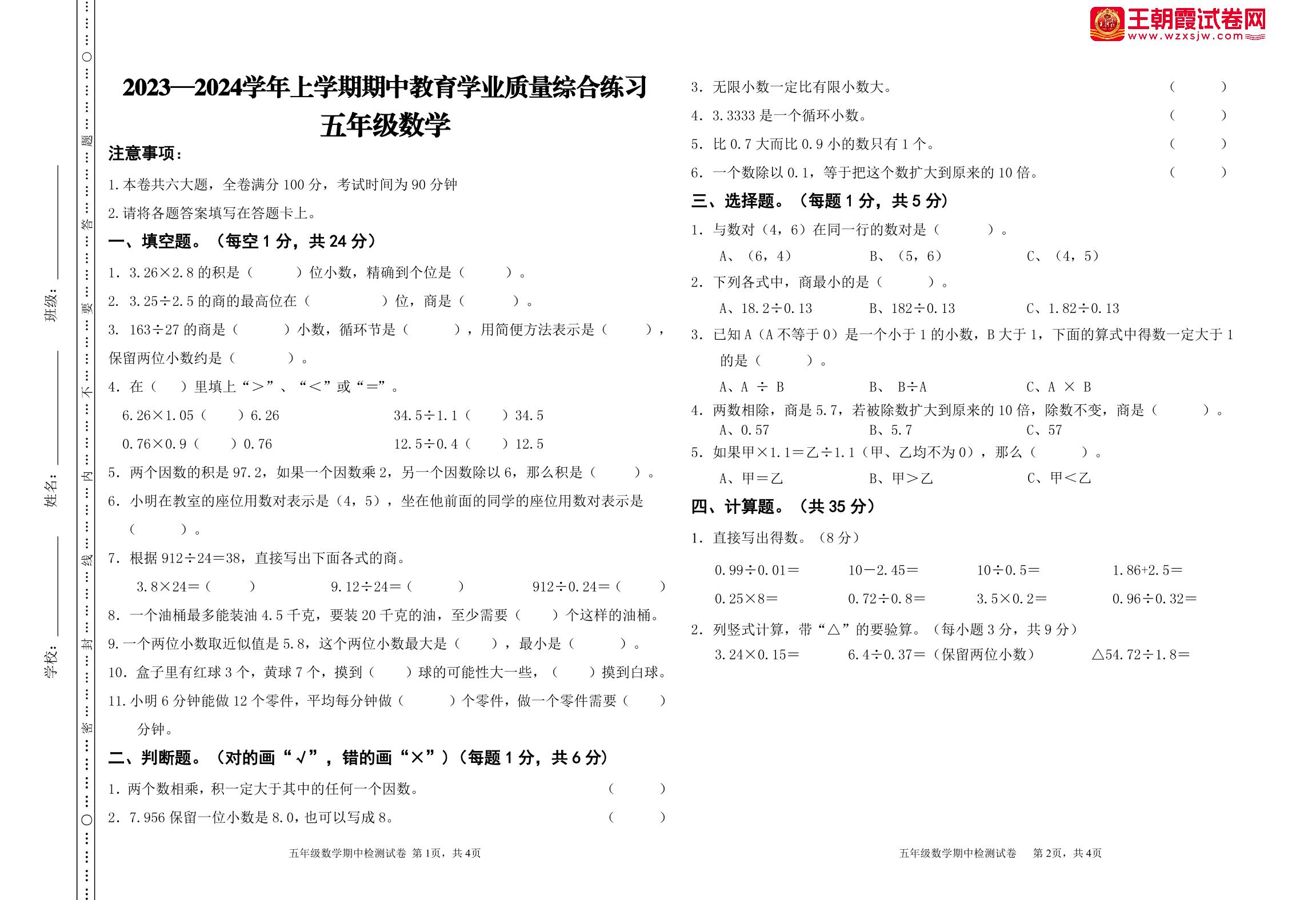 云南省楚雄彝族自治州楚雄市2023-2024学年上学期期中教育学业质量综合练习试卷五年级数学(人教版)