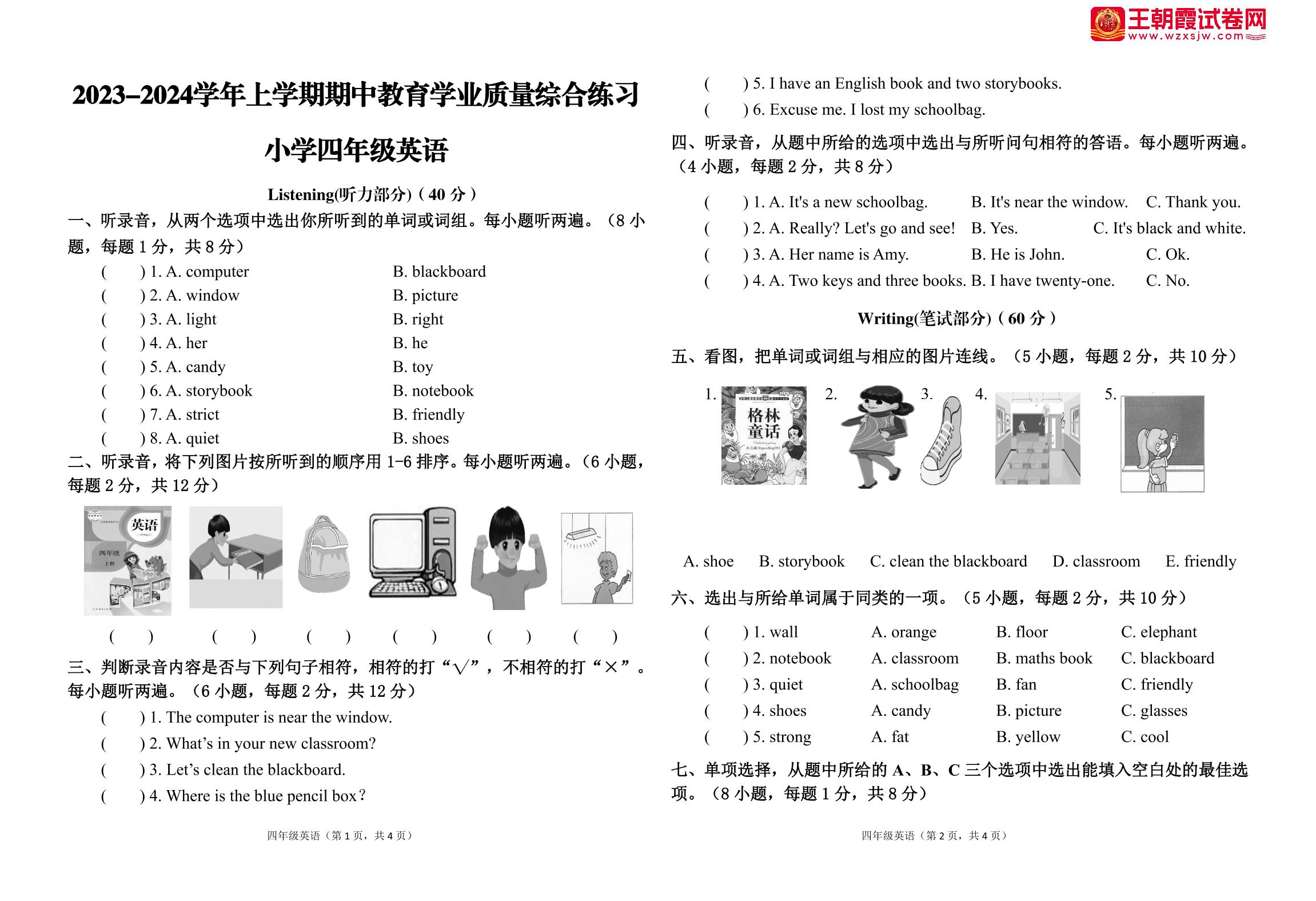 四年级英语人教PEP版(三起始)上册期中卷